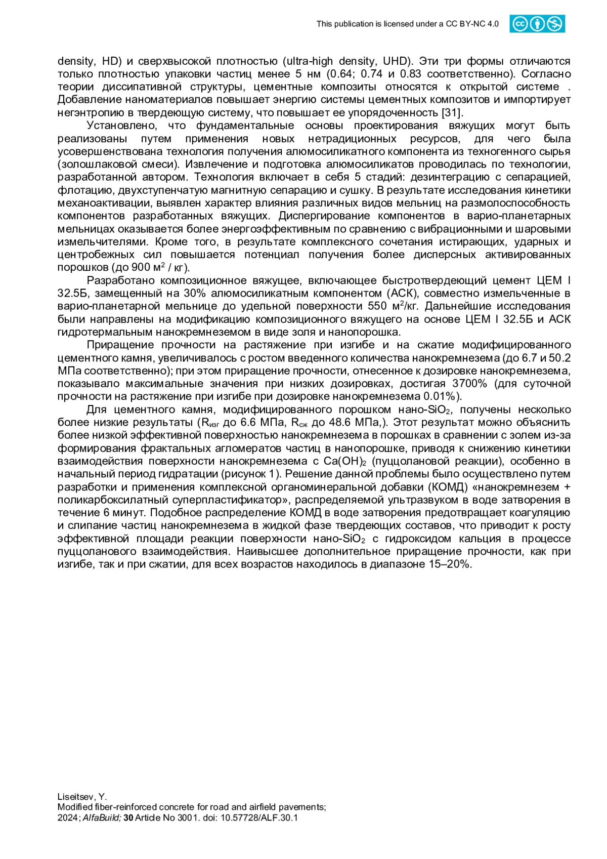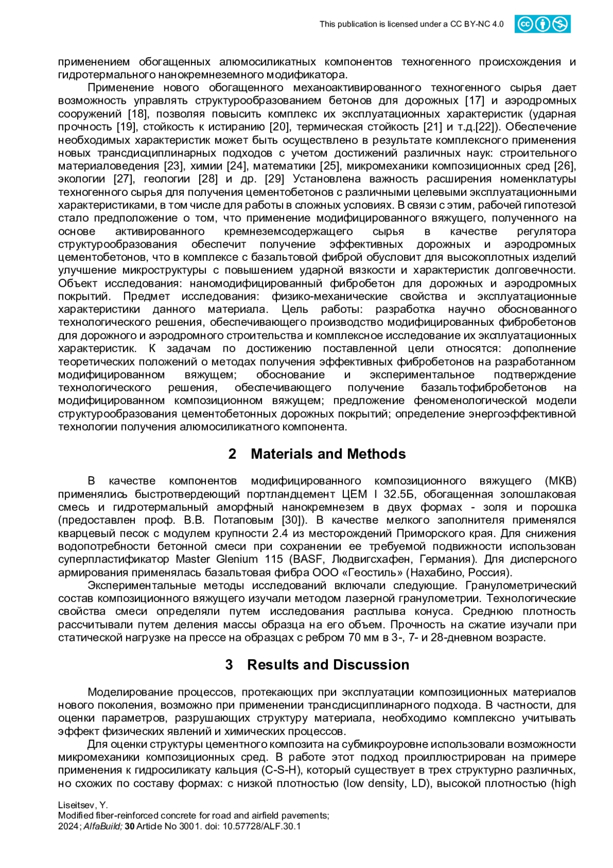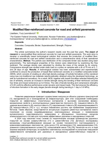 В статье обобщаются результаты исследований автора за последние несколько лет. Объектом исследования является наномодифицированный фибробетон для дорожных и аэродромных покрытий. Целью работы является разработка научно обоснованного технологического решения, обеспечивающего производство модифицированного фибробетона для дорожного и аэродромного строительства, а также всестороннее изучение его эксплуатационных характеристик. Метод. Распределение частиц по размерам в композитном вяжущем изучалось с помощью лазерной гранулометрии. Технологические свойства смеси определялись путем изучения поточного осадка. Средняя плотность была рассчитана путем деления массы образца на его объем. Прочность на сжатие изучалась при статической нагрузке на прессе на образцах с ребром 70 мм в возрасте 3, 7 и 28 дней. Результаты. Обосновано и экспериментально подтверждено технологическое решение для производства базальтофибробетона на модифицированном композиционном вяжущем (МКВ), которое заключается в создании пакета гидратных образований сверхвысокой плотности на наноуровне с использованием нового нетрадиционного сырья (алюмосиликатов, полученных по разработанной технологии, а также гидротермальной нанокремнезёмной массы). В результате MCB в сочетании с базальтовой микрофиброй, подобранной по закону подобия, обеспечивает увеличение прочности на растяжение при изгибе фибробетона в четыре раза и ударопрочности до 9 раз. Соотношение прочности на растяжение при изгибе и прочности на сжатие, равное 0,25, подтверждает эффективность работы при динамических и ударных нагрузках. Этот факт обеспечивает эффективность формирования структуры на ранних стадиях (прочность на растяжение при изгибе через 1 день составляет 3,6 МПа).
