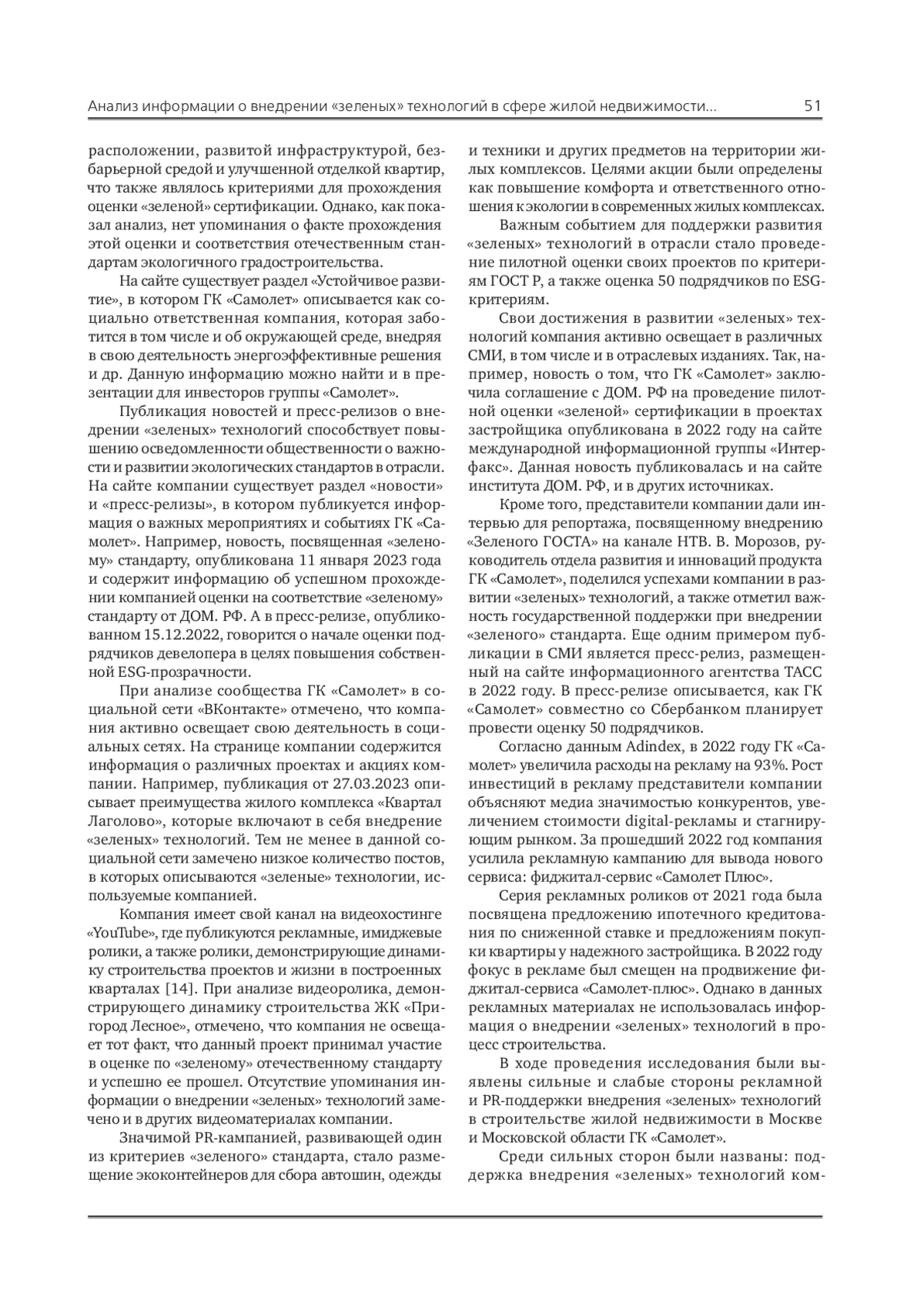 Введение. Направление исследований, связанное с анализом информации о внедрении «зеленых» технологий в контексте управления устойчивым развитием российских компаний в сфере жилой недвижимости, является достаточно актуальным. Это обусловлено изменением покупательских предпочтений, усилением роли и значения экологических проблем и аспектов, нарастанием кризисных явлений в мировой и национальной экономических системах.