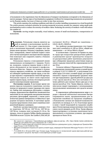 В настоящей статье рассмотрены условия труда и риски рабочего по установке памятников в ритуальном хозяйстве. В статье представлены технические решения по перемещению памятных сооружений по территории кладбища с использованием средств малой механизации, позволяющие снизить тяжесть труда рабочих. Снижение тяжести труда работников позволит сократить количество заболеваний, связанных с профессиональной деятельностью.