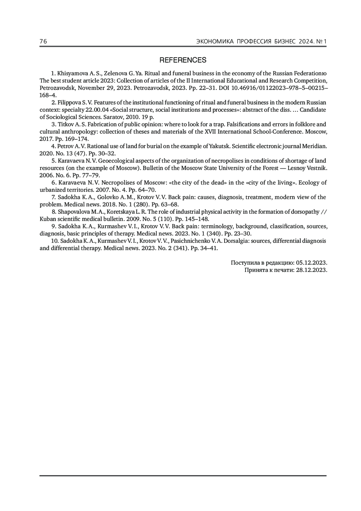 1. Хисямова А. С., Зеленова Г. Я. Ритуально-похоронное дело в экономике Российской Федерации // Лучшая студенческая статья 2023: сборник статей II Международного учебно-исследовательского конкурса, Петрозаводск, 29 ноября 2023 года. Петрозаводск, 2023. С. 22-31. DOI: 10.46916/01122023-9785-00215-168-4 EDN: ABUKLQ