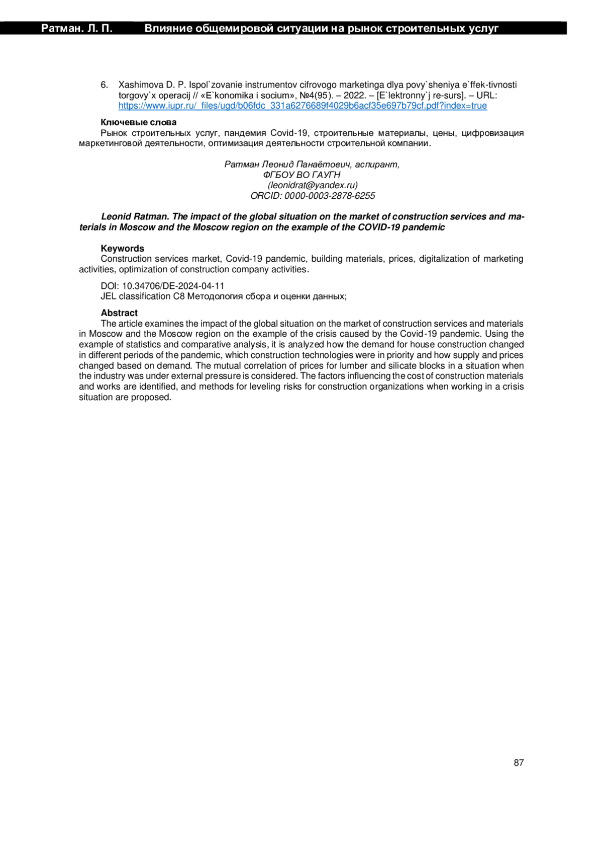 2. Бадушева В.Д., Палагин А.А. Развитие отрасли строительства под влиянием COVID 19// Вестник Академии знаний № 39(4). - 2020. - С. 82-84. [Электронный ресурс]. - URL: https://cyberleninka.ru/article/n/razvitie-otrasli-stroitelstva-pod-vliyaniem-covid-19/viewer (дата обращения: 20.01.2024).