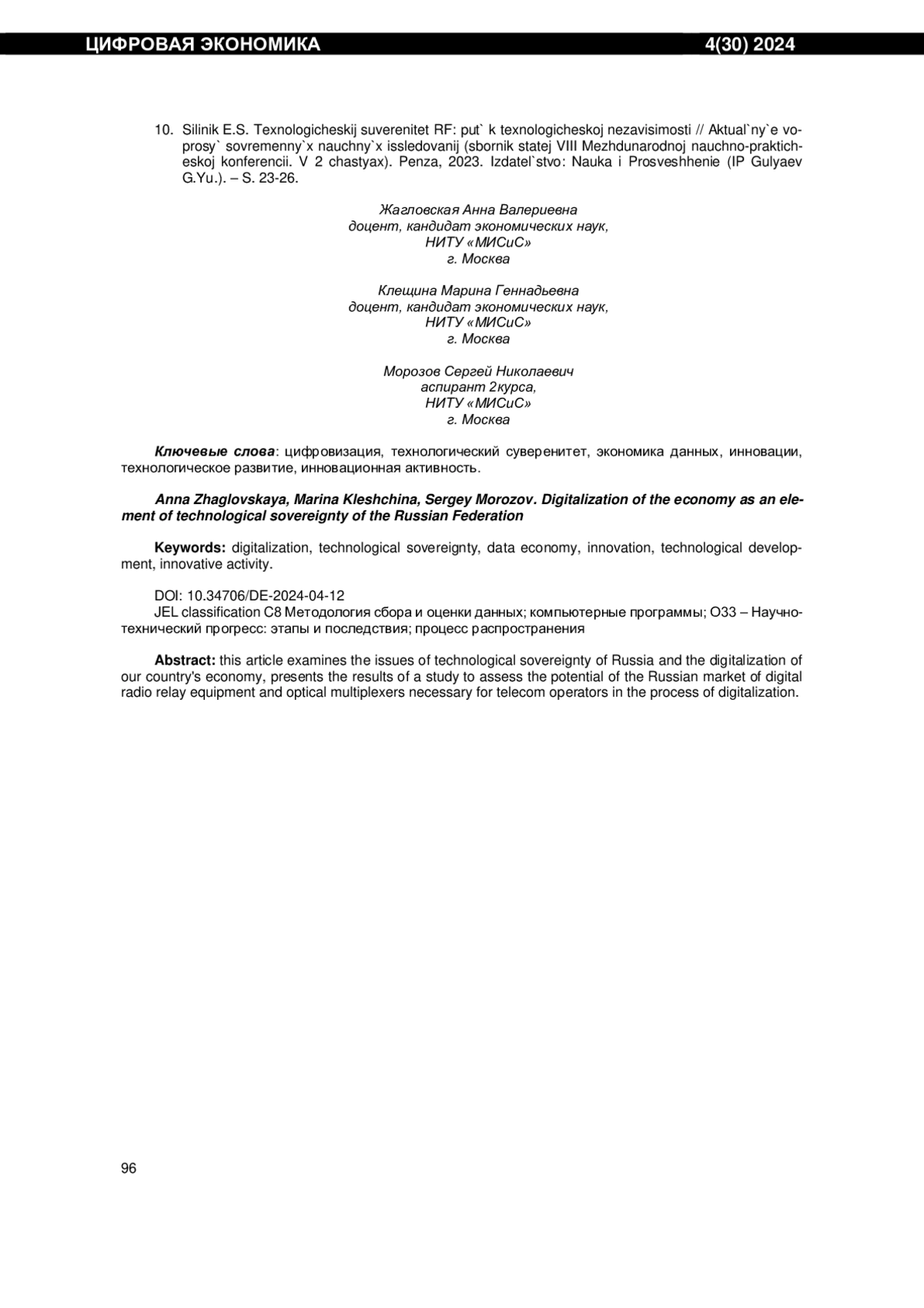 10. Силиник Е.С. Технологический суверенитет РФ: путь к технологической независимости // Актуальные вопросы современных научных исследований (сборник статей VIII Международной научно-практической конференции. В 2 частях). Пенза, 2023. Издательство: Наука и Просвещение (ИП Гуляев Г.Ю.). - С. 23-26. EDN: WRMHIS