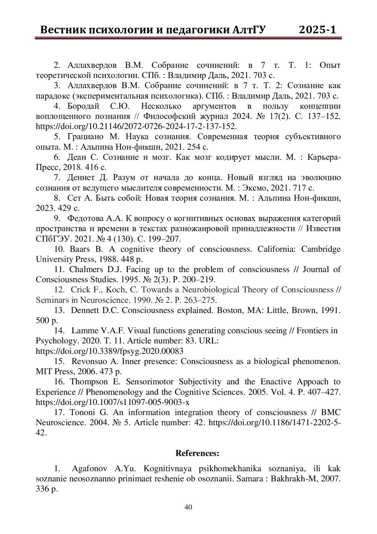 1. Агафонов А.Ю. Когнитивная психомеханика сознания, или Как сознание неосознанно принимает решение об осознании. Самара: Бахрах-М, 2007. 336 с. EDN: XWIZBZ