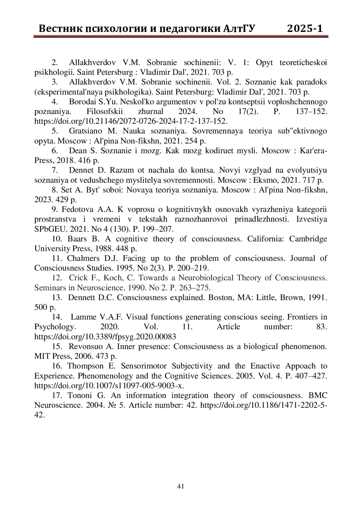 17. Tononi G. An information integration theory of consciousness // BMC Neuroscience. 2004. № 5. Article number: 42. DOI: 10.1186/1471-2202-5-42 EDN: EGCMOY