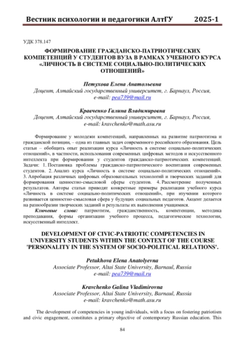 Цель статьи - обобщить опыт реализации курса «Личность в системе социально-политических отношений», в частности, использования современных цифровых методов и искусственного интеллекта при формировании у студентов гражданско-патриотических компетенций.