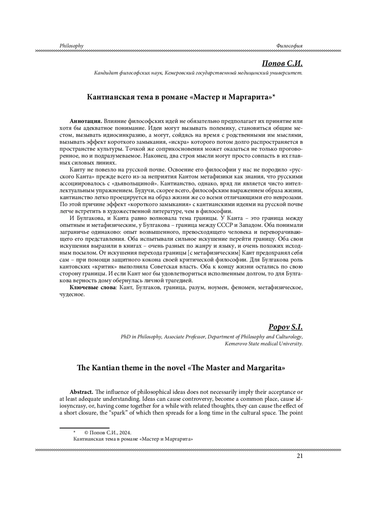 Влияние философских идей не обязательно предполагает их принятие или хотя бы адекватное понимание. Идеи могут вызывать полемику, становиться общим местом, вызывать идиосинкразию, а могут, сойдясь на время с родственными им мыслями, вызывать эффект короткого замыкания, «искра» которого потом долго распространяется в пространстве культуры. Точкой же соприкосновения может оказаться не только проговоренное, но и подразумеваемое. Наконец, два строя мысли могут просто совпасть в их главных силовых линиях. Канту не повезло на русской почве. Освоение его философии у нас не породило «русского Канта» прежде всего из-за неприятия Кантом метафизики как знания, что русскими ассоциировалось с «дьявольщиной». Кантианство, однако, вряд ли является чисто интеллектуальным упражнением. Будучи, скорее всего, философским выражением образа жизни, кантианство легко проецируется на образ жизни же со всеми отличающими его неврозами. По этой причине эффект «короткого замыкания» с кантианскими идеями на русской почве легче встретить в художественной литературе, чем в философии. И Булгакова, и Канта равно волновала тема границы. У Канта - это граница между опытным и метафизическим, у Булгакова - граница между СССР и Западом. Оба понимали заграничье одинаково: опыт возвышенного, превосходящего человека и переворачивающего его представления. Оба испытывали сильное искушение перейти границу. Оба свои искушения выразили в книгах - очень разных по жанру и языку, и очень похожих исходным посылом. От искушения перехода границы [c метафизическим] Кант предохранял себя сам - при помощи защитного кокона своей критической философии. Для Булгакова роль кантовских «критик» выполняла Советская власть. Оба к концу жизни остались по свою сторону границы. И если Кант мог бы удовлетвориться исполненным долгом, то для Булгакова верность дому обернулась личной трагедией.