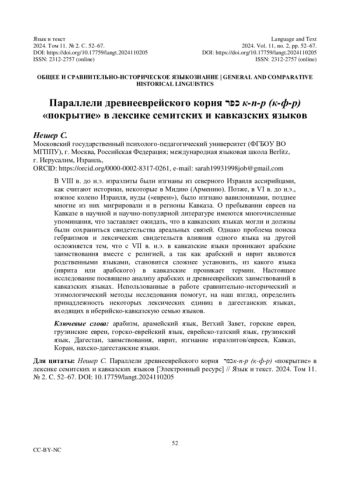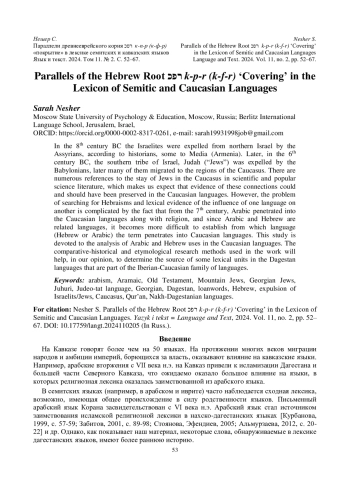 В VIII в. до н. э. израэлиты были изгнаны из северного Израиля ассирийцами, как считают историки, некоторые в Мидию (Армению). Позже, в VI в. до н. э., южное колено Израиля, иуды («евреи»), было изгнано вавилонянами, позднее многие из них мигрировали и в регионы Кавказа. О пребывании евреев на Кавказе в научной и научно-популярной литературе имеются многочисленные упоминания, что заставляет ожидать, что в кавказских языках могли и должны были сохраниться свидетельства ареальных связей. Однако проблема поиска гебраизмов и лексических свидетельств влияния одного языка на другой осложняется тем, что с VII в. н. э. в кавказские языки проникают арабские заимствования вместе с религией, а так как арабский и иврит являются родственными языками, становится сложнее установить, из какого языка (иврита или арабского) в кавказские проникает термин. Настоящее исследование посвящено анализу арабских и древнееврейских заимствований в кавказских языках. Использованные в работе сравнительно-исторический и этимологический методы исследования помогут, на наш взгляд, определить принадлежность некоторых лексических единиц в дагестанских языках, входящих в иберийско-кавказскую семью языков.