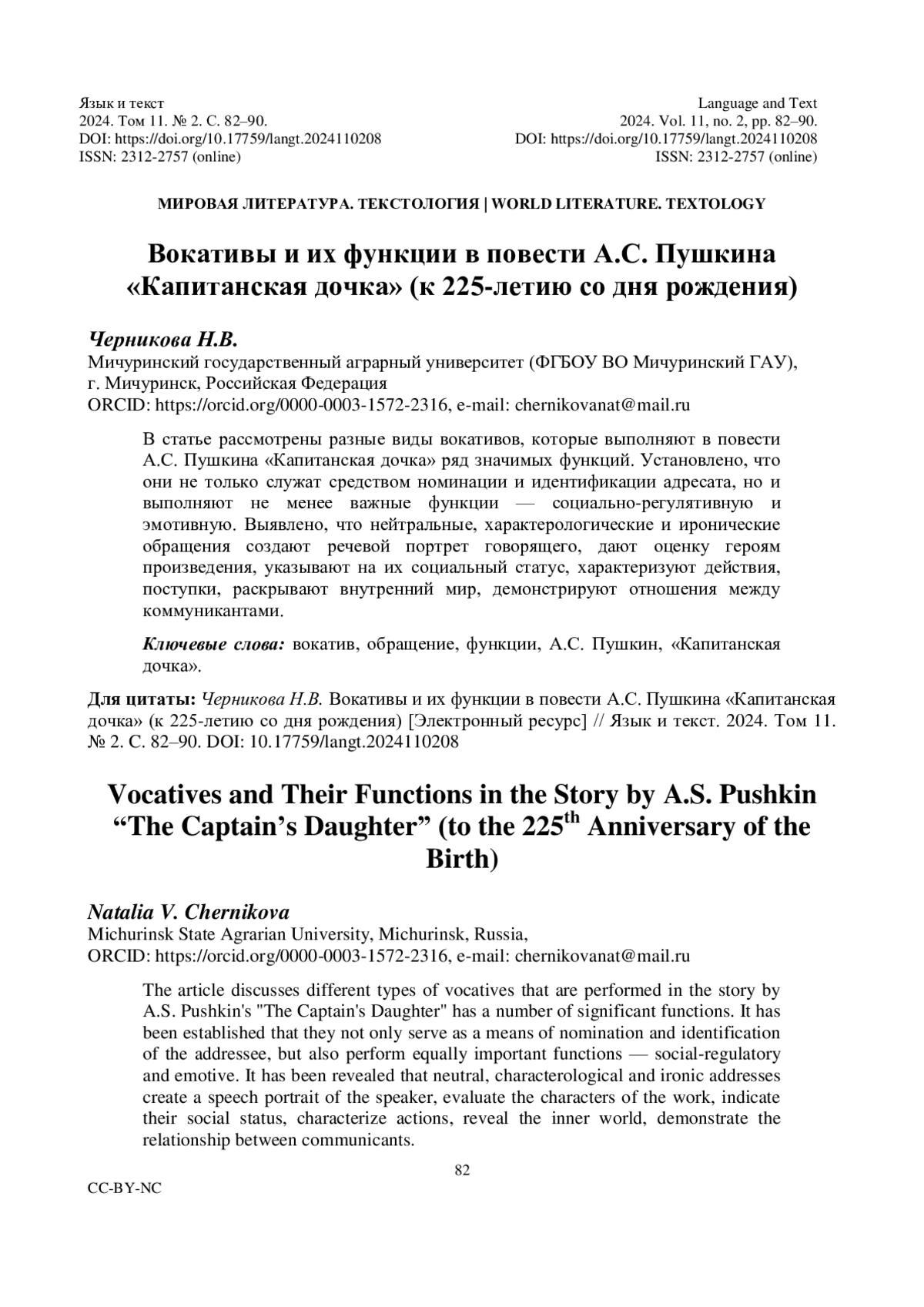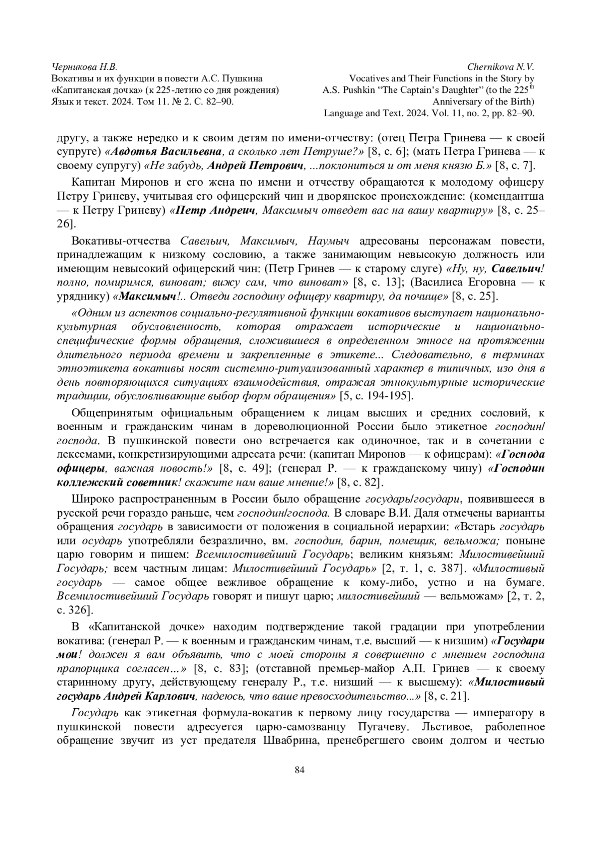 В статье рассмотрены разные виды вокативов, которые выполняют в повести А. С. Пушкина «Капитанская дочка» ряд значимых функций. Установлено, что они не только служат средством номинации и идентификации адресата, но и выполняют не менее важные функции - социально-регулятивную и эмотивную. Выявлено, что нейтральные, характерологические и иронические обращения создают речевой портрет говорящего, дают оценку героям произведения, указывают на их социальный статус, характеризуют действия, поступки, раскрывают внутренний мир, демонстрируют отношения между коммуникантами.