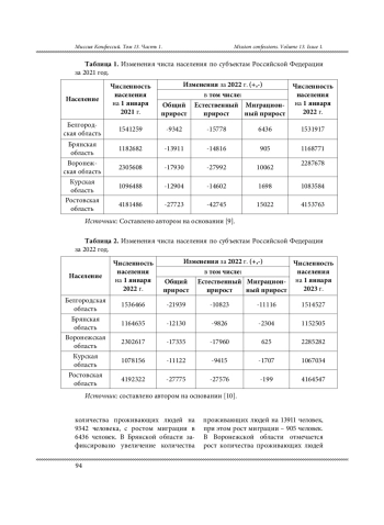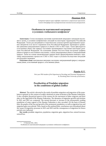 Статья посвящена изучению маятниковой миграции и миграции населения в целом, в условиях конфликтных ситуаций на некоторых территориях Российской Федерации. Также рассматриваются теоретические аспекты причин перемещения трудовых мигрантов и их место в правовом поле Российской Федерации. Проводится сравнение динамики миграционного прироста и убыли в 2021 и 2022 годах. Также фиксируется естественная убыль или прирост постоянно проживающего населения некоторых регионов Российской Федерации. На основании данных Росстата были построены графики убыли и прироста постоянного населения, а также миграционная убыль и миграционный прирост. Затем на основе анализируемых данных были сформулированы выводы о причинах миграционных процессов в 2021 и 2022 годах и указаны последствия миграций для будущих периодов.