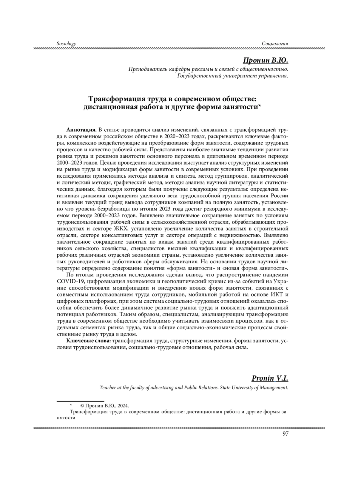 В статье проводится анализ изменений, связанных с трансформацией труда в современном российском обществе в 2020-2023 годах, раскрываются ключевые факторы, комплексно воздействующие на преобразование форм занятости, содержание трудовых процессов и качество рабочей силы. Представлены наиболее значимые тенденции развития рынка труда и режимов занятости основного персонала в длительном временном периоде 2000-2023 годов. Целью проведения исследования выступает анализ структурных изменений на рынке труда и модификация форм занятости в современных условиях. При проведении исследования применялись методы анализа и синтеза, метод группировок, аналитический и логический методы, графический метод, методы анализа научной литературы и статистических данных, благодаря которым были получены следующие результаты: определена негативная динамика сокращения удельного веса трудоспособной группы населения России и выявлен текущий тренд вывода сотрудников компаний на полную занятость, установлено что уровень безработицы по итогам 2023 года достиг рекордного минимума в исследуемом периоде 2000-2023 годов. Выявлено значительное сокращение занятых по условиям трудоиспользования рабочей силы в сельскохозяйственной отрасли, обрабатывающих производствах и секторе ЖКХ, установлено увеличение количества занятых в строительной отрасли, секторе консалтинговых услуг и секторе операций с недвижимостью. Выявлено значительное сокращение занятых по видам занятий среди квалифицированных работников сельского хозяйства, специалистов высшей квалификации и квалифицированных рабочих различных отраслей экономики страны, установлено увеличение количества занятых руководителей и работников сферы обслуживания. На основании трудов научной литературы определено содержание понятия «форма занятости» и «новая форма занятости». По итогам проведения исследования сделан вывод, что распространение пандемии COVID-19, цифровизация экономики и геополитический кризис из-за событий на Украине способствовали модификации и внедрению новых форм занятости, связанных с совместным использованием труда сотрудников, мобильной работой на основе ИКТ и цифровых платформах, при этом система социально-трудовых отношений оказалась способна обеспечить более динамичное развитие рынка труда и повысить адаптационный потенциал работников. Таким образом, специалистам, анализирующим трансформацию труда в современном обществе необходимо учитывать взаимосвязи процессов, как в отдельных сегментах рынка труда, так и общие социально-экономические процессы свойственные рынку труда в целом.
