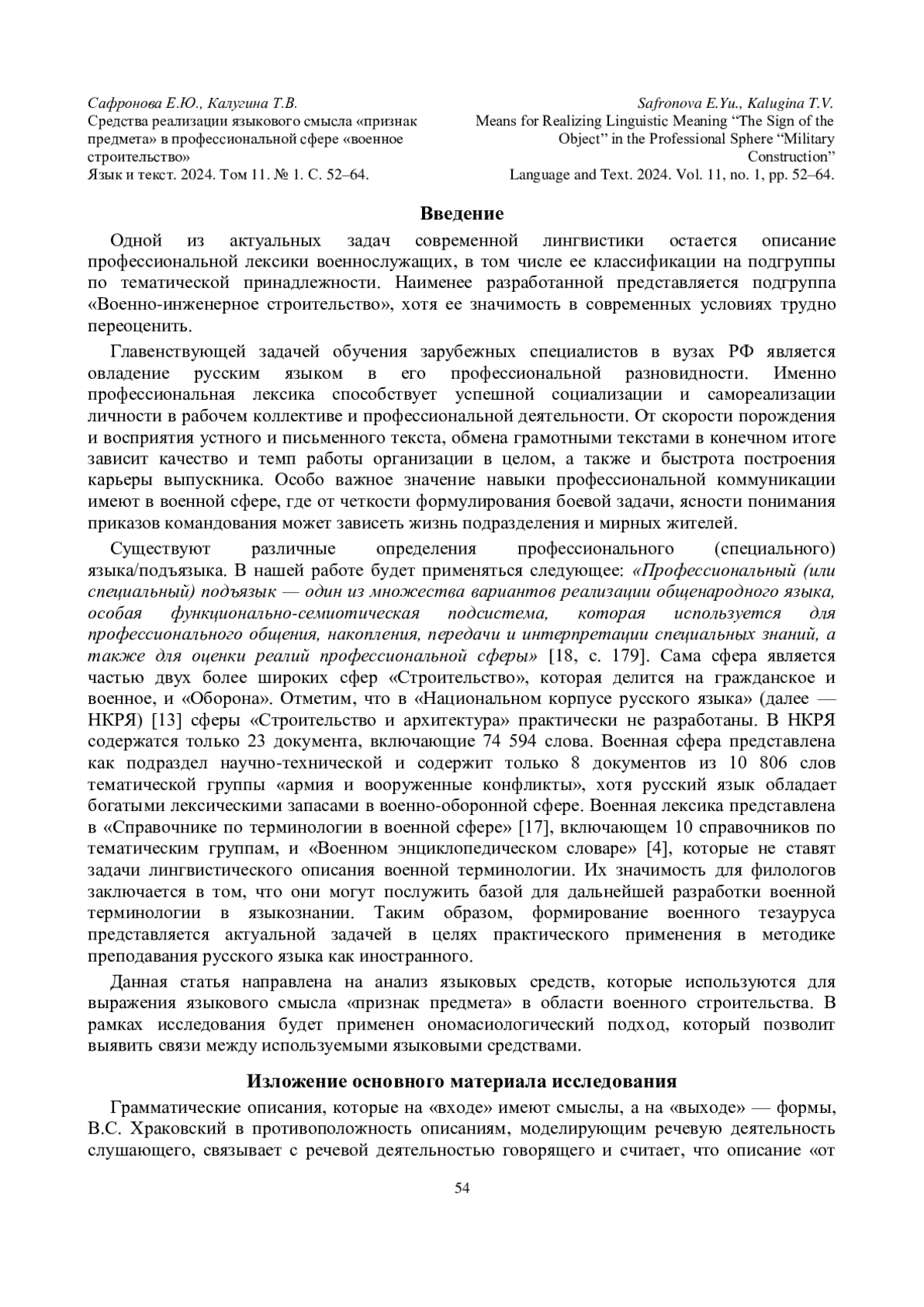 В статье рассматриваются языковые средства выражения языкового смысла «признак предмета» в военно-инженерном подъязыке. Для строительной сферы актуальны относительные прилагательные, описывающие различные свойства строительных материалов, и их однокоренные имена существительные. Для характеристики материалов используются имена прилагательные, обозначающие гидрофизические, теплофизические, физико-химические, механические, химические, технологические, эксплуатационные и специальные свойства. Количественные числительные реже, чем порядковые прилагательные, участвуют в выражении языкового смысла «признак предмета» и являются несогласованными неморфологизованными определениями, однако в военно-инженерной сфере они активны при характеристике количественных параметров температуры, толщины, глубины, высоты и других характеристик строительных объектов. Ономасиологическая соотносительность между относительными именами прилагательными и причастиями в строительной сфере наблюдается в конструкциях «имя прилагательное» - «обладающий определенным качеством предмет»; «имя прилагательное - сделанный из определенного материала предмет»; «имя прилагательное - построенный из определенного материала предмет». Выявлено, что говорящие предпочитают использование относительных имен прилагательных для обозначения используемых строительных материалов; причастия - для обозначения строительных технологических процессов; количественные имена числительные - для обозначения номенклатурных наименований строительных механизмов. Имена прилагательные и причастия в составе терминологических сочетаний представляют собой контаминацию языковых смыслов «признак предмета» и «предмет».