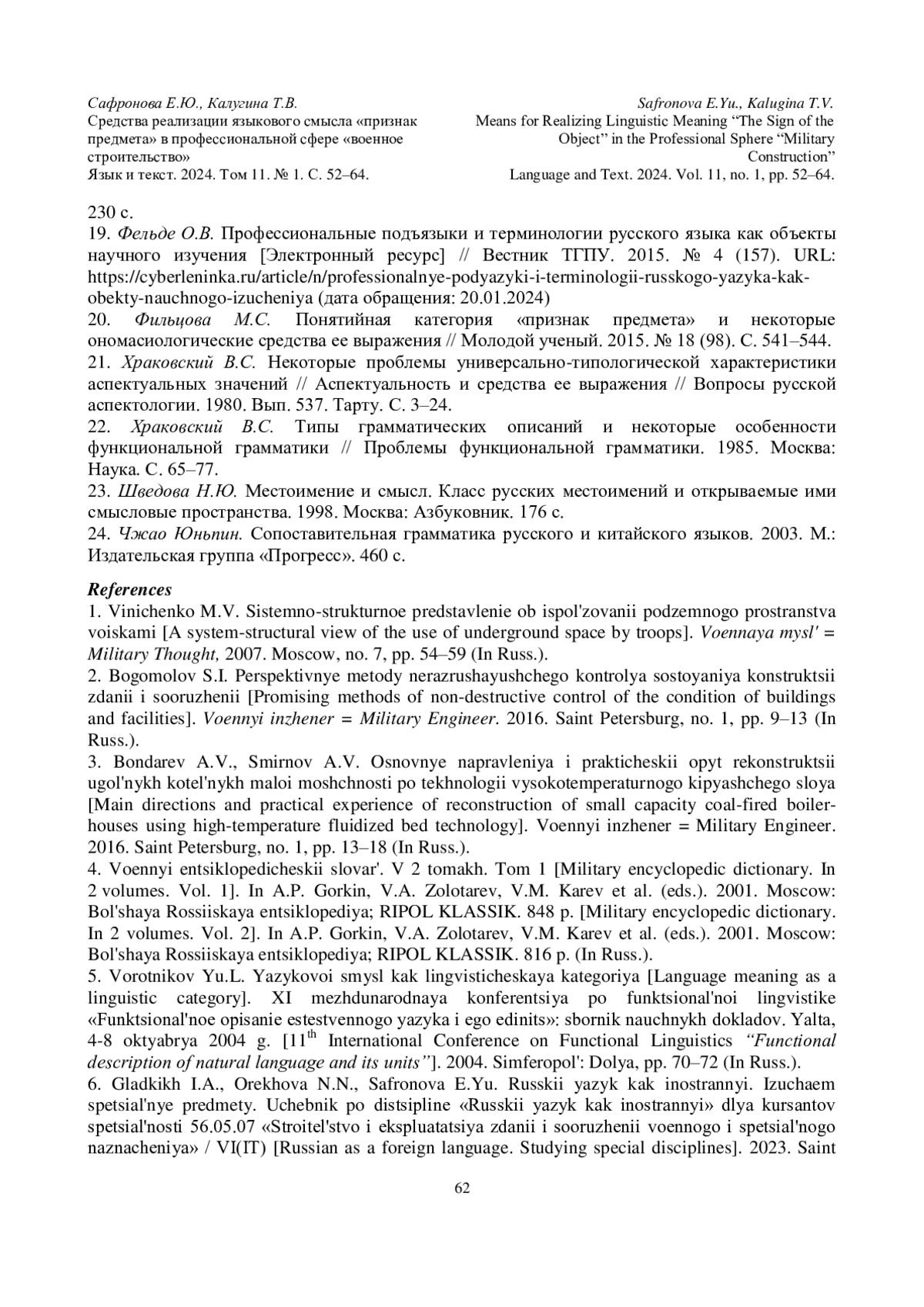 6. Гладких И.А., Орехова Н.Н., Сафронова Е.Ю. Русский язык как иностранный. Изучаем специальные предметы. Учебник по дисциплине “Русский язык как иностранный” для курсантов специальности 56.05.07 “Строительство и эксплуатация зданий и сооружений военного и специального назначения” / ВИ(ИТ). 2023. СПб. 161 с.