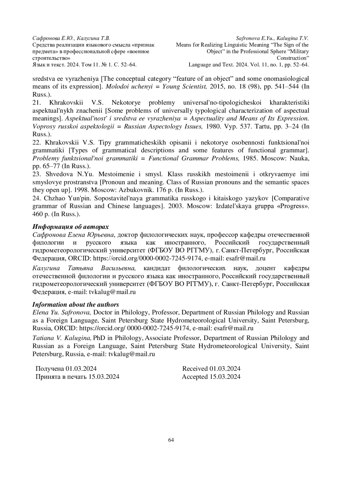 Gladkikh I.A., Orekhova N.N., Safronova E.Yu. Russkii yazyk kak inostrannyi. Izuchaem spetsial’nye predmety. Uchebnik po distsipline “Russkii yazyk kak inostrannyi” dlya kursantov spetsial’nosti 56.05.07 “Stroitel’stvo i ekspluatatsiya zdanii i sooruzhenii voennogo i spetsial’nogo naznacheniya” / VI(IT) [Russian as a foreign language. Studying special disciplines]. 2023. Saint Petersburg. 161 p.