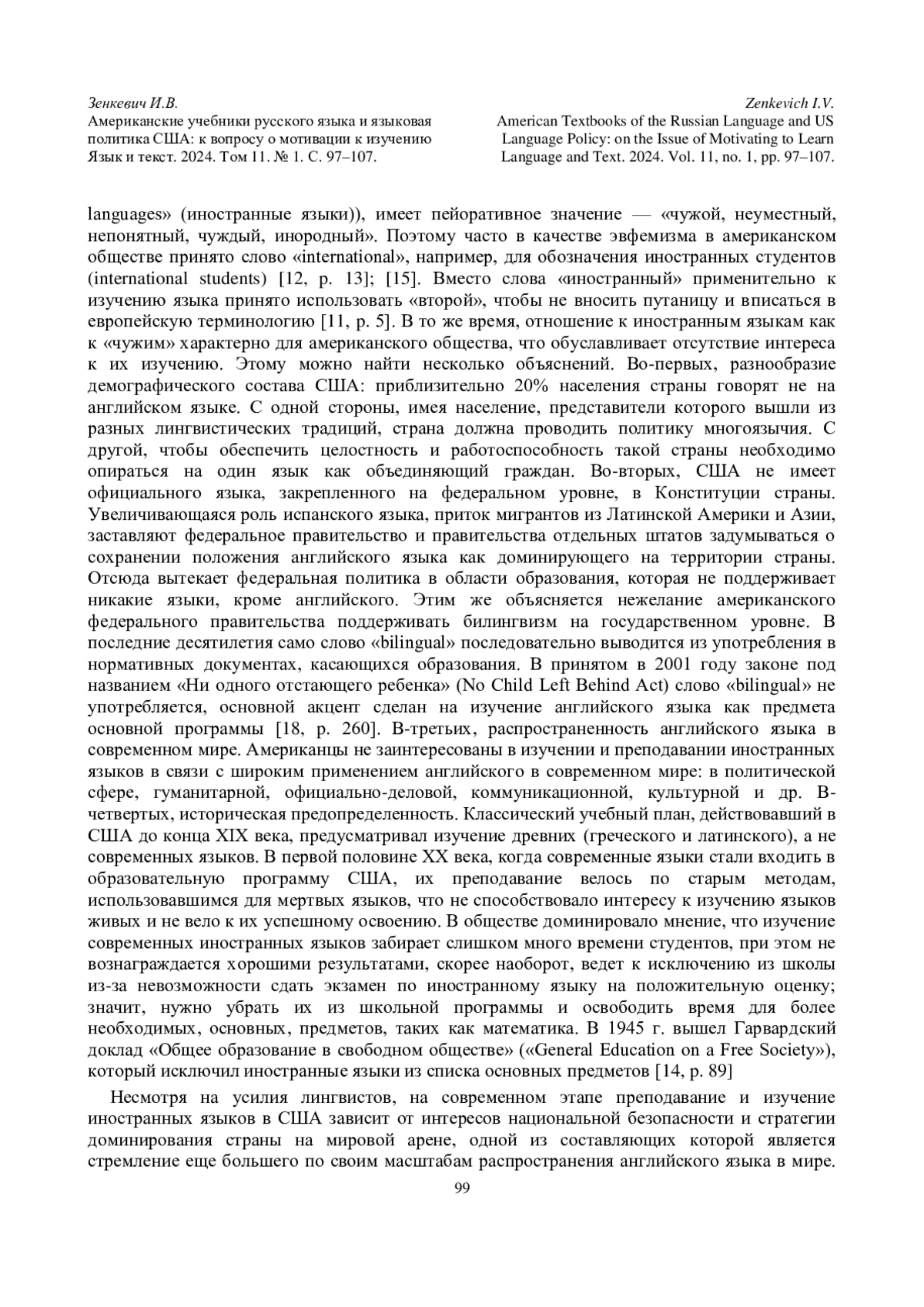 Статья посвящена изучению языковой политики США в области преподавания иностранных языков, в том числе русского, и взаимосвязи языковой политики и стратегии национальной безопасности страны. В то же время, из-за отсутствия федерального регулирования в сфере преподавания иностранных языков создание и использование учебников русского языка как иностранного не регламентируется и отдано на усмотрение учебных и региональных организаций на местах. На основе исследования учебников русского языка как иностранного, составленных американскими авторами с начала ХХ по начало ХХI века, проведенного по нескольким параметрам: содержание предисловий, методической и мотивационной составляющей, текстового и лексического материала, а также целевой аудитории, автор статьи приходит к выводу о том, что учебники не отражают реальной картины культурной и общественной жизни в России, не мотивируют обучающихся, не успевают за изменениями, происходящими в российском обществе и таким образом участвуют в создании ложного стереотипного образа нашей страны у американских обучающихся. Решение данной ситуации автор видит в создании цифровых учебников русского языка как иностранного.
