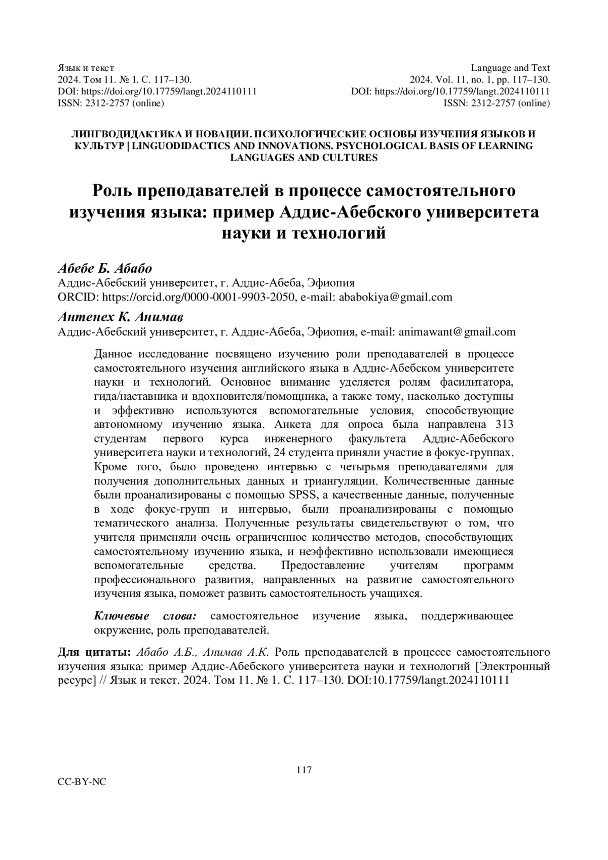 Данное исследование посвящено изучению роли преподавателей в процессе самостоятельного изучения английского языка в Аддис-Абебском университете науки и технологий. Основное внимание уделяется ролям фасилитатора, гида/наставника и вдохновителя/помощника, а также тому, насколько доступны и эффективно используются вспомогательные условия, способствующие автономному изучению языка. Анкета для опроса была направлена 313 студентам первого курса инженерного факультета Аддис-Абебского университета науки и технологий, 24 студента приняли участие в фокус-группах. Кроме того, было проведено интервью с четырьмя преподавателями для получения дополнительных данных и триангуляции. Количественные данные были проанализированы с помощью SPSS, а качественные данные, полученные в ходе фокус-групп и интервью, были проанализированы с помощью тематического анализа. Полученные результаты свидетельствуют о том, что учителя применяли очень ограниченное количество методов, способствующих самостоятельному изучению языка, и неэффективно использовали имеющиеся вспомогательные средства. Предоставление учителям программ профессионального развития, направленных на развитие самостоятельного изучения языка, поможет развить самостоятельность учащихся.