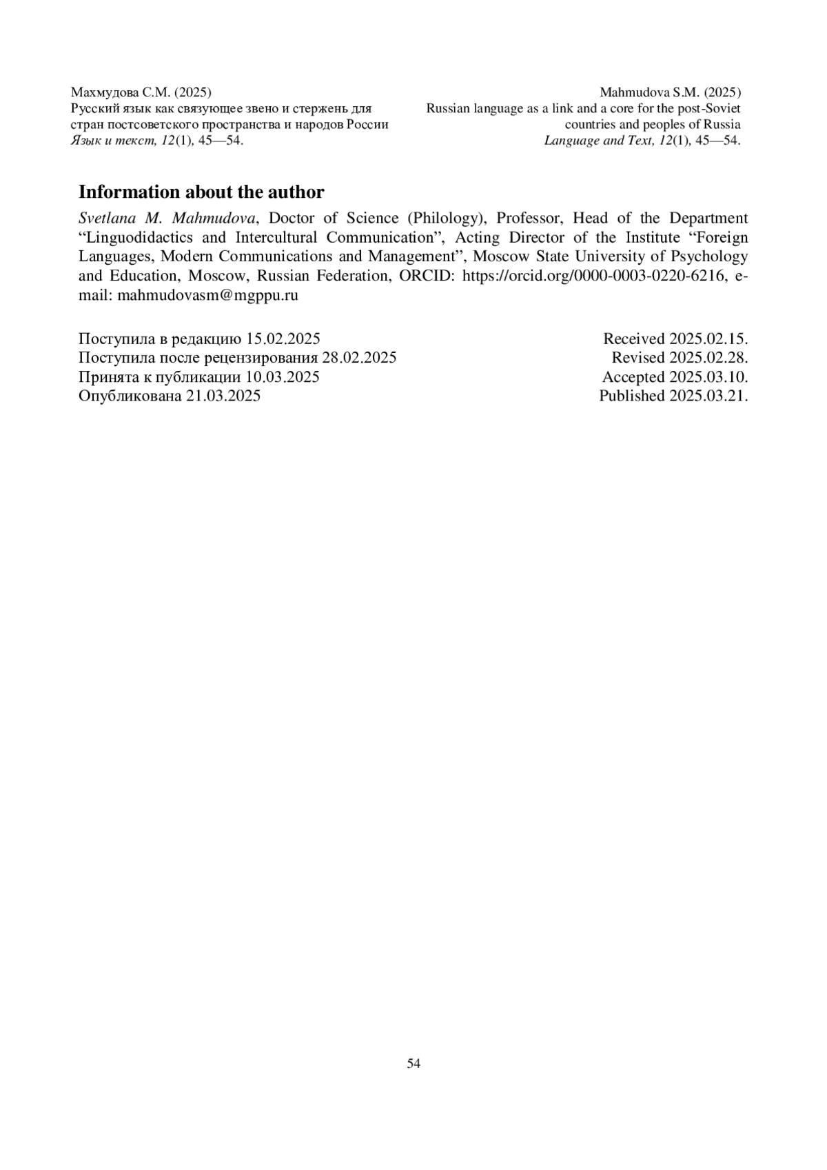 МАХМУДОВА С.М. РУССКИЙ ЯЗЫК КАК СВЯЗУЮЩЕЕ ЗВЕНО И СТЕРЖЕНЬ ДЛЯ СТРАН ПОСТСОВЕТСКОГО ПРОСТРАНСТВА И НАРОДОВ РОССИИ // ЯЗЫК И ТЕКСТ. 2025. Т. 12 № 1