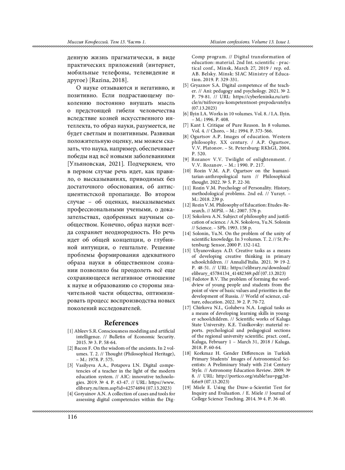 20. Razina T. Opportunities аnd Specificity Of Applying The Draw-A-Scientist Test Technique On Russian Schoolchildren. Vol. XLIII. / Tatyana Razina, Elena Volodarskaya // The European Proceedings of Social &Behavioural Sciences EpSBS. 2018. P. 109-117. // URL: download/elibrary_38149369_63016946.pdf (Дата обращения: 13.07.2023). EDN: HATSIF