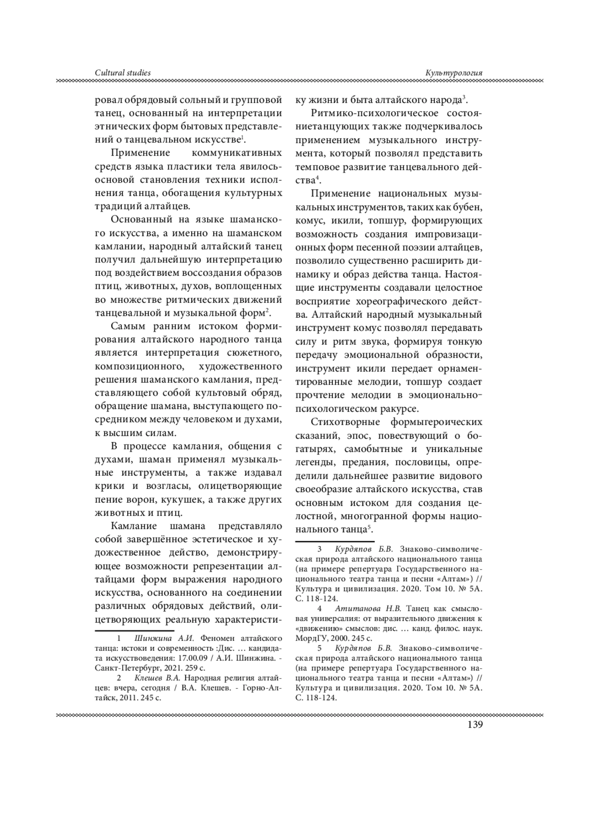 6. Курдяпов Б.В. Знаково-символическая природа алтайского национального танца (на примере репертуара Государственного национального театра танца и песни “Алтам”) // Культура и цивилизация. 2020. Том 10. № 5А. С. 118-124. EDN: QFBXBQ