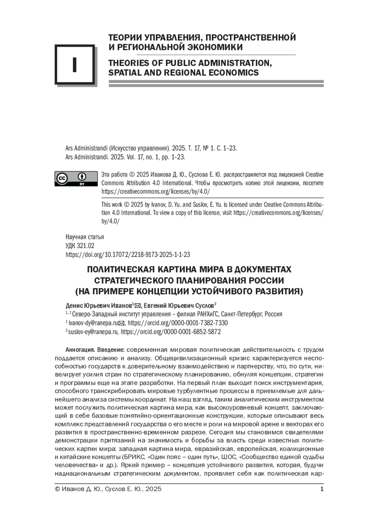 Введение: современная мировая политическая действительность с трудом поддается описанию и анализу. Общецивилизационный кризис характеризуется неспособностью государств к доверительному взаимодействию и партнерству, что, по сути, нивелирует усилия стран по стратегическому планированию, обнуляя концепции, стратегии и программы еще на этапе разработки. На первый план выходит поиск инструментария, способного транскрибировать мировые турбулентные процессы в приемлемые для дальнейшего анализа системы координат. На наш взгляд, таким аналитическим инструментом может послужить политическая картина мира, как высокоуровневый концепт, заключающий в себе базовые понятийно-ориентационные конструкции, которые описывают весь комплекс представлений государства о его месте и роли на мировой арене и векторах его развития в пространственно-временном разрезе. Сегодня мы становимся свидетелями демонстрации притязаний на значимость и борьбы за власть среди известных политических картин мира: западная картина мира, евразийская, европейская, коалиционные и китайские концепты (БРИКС, «Один пояс – один путь», ШОС, «Сообщество единой судьбы человечества» и др.). Яркий пример – концепция устойчивого развития, которая, будучи наднациональным стратегическим документом, проявляет себя как политическая картина мира. Несмотря на всеобщее принятие, она получила избирательную имплементацию в национальных стратегических нормах и остается примером научных споров об источниковом происхождении и принадлежности к западной модели мироустройства. Цель: проанализировать место, роль и функции политической картины мира в системе документов стратегического планирования в России (на примере концепции устойчивого развития). Методы: исторический анализ, сравнительные методы, контент-анализ. Результаты: структурными элементами политической картины мира являются базовые общецивилизационные и политические категории: культура, мораль и право, политический порядок, идеологии, нации, государства, история, языки и т. д. Концепция устойчивого развития обладает структурными категориями, сходными с концептом «политическая картина мира». Следует зафиксировать тенденцию политизации концепции устойчивого развития и ее противоречивый характер, который проявляется, с одной стороны, во всеобщем ее принятии мировым сообществом, а с другой – в зарождающемся дискурсе об источниковом происхождении и «опасном» соответствии ее структурных элементов компонентам, образующим национальные политические картины мира, и, как следствие, необходимости адаптации целей устойчивого развития к особенностям национальных политических картин мира. Выводы: система стратегического планирования и институты выработки стратегической политики России являются картиноформирующими институтами, а документы стратегического планирования содержат в себе структурные элементы, составляющие политическую картину мира. Концепция устойчивого развития в целом встроена в документы стратегического планирования России. Несмотря на расхождение по таким категориям, как вопросы войны и мира, безопасности, соблюдения суверенитета, развития в обществе идей справедливости, патриотизма и волонтерства, концепция устойчивого развития выглядит базовым ядром рассмотренных документов 