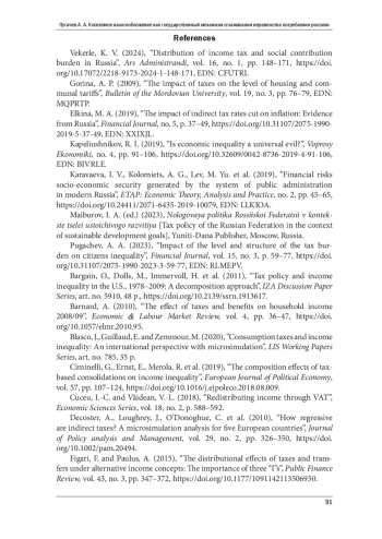 - Pugachev A. A. The impact of indirect taxation on inequality in Russia // Journal of Tax Reform. 2023. Vol. 9, № 1. P. 19–33. https://doi.org/10.15826/jtr.2023.9.1.126. EDN: QXJDCS.