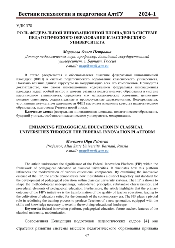 8. Морозова О.П. Развитие педагогического образования в классическом университете: инновационные модели подготовки учительских кадров // Молодые университеты на пути инновационного развития: история и современность: матери-алы Международной науч.-практ. конфции: АлтГУ, Барнаул, 2023. EDN: LUBLSQ