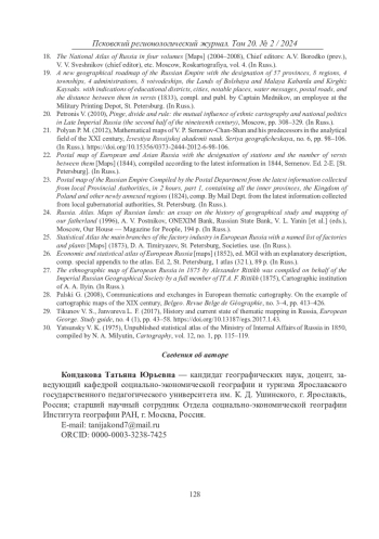 15. Кондакова Т. Ю. Социально-экономическая статистика второй половины XIX - начала XX в. как источниковая база для историко-географического исследования хозяйственных районов России // Известия Российской академии наук. Серия географическая. 2023. Т. 87. № 5. С. 766-780. EDN: GBLOMH