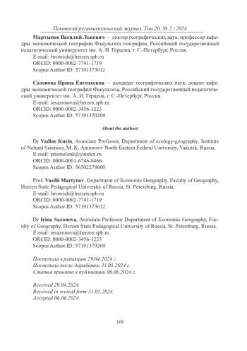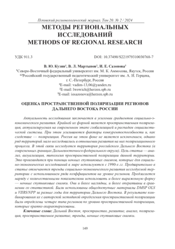 10. Кузин В. Ю. Оценка пространственной поляризации Дальнего Востока России в постсоветский период // Вестник СВФУ. Серия “Науки о Земле”. 2023. № 2 (30). С. 102-113. https://doi.org/10,25587/SVFU.2023.30.2.009. EDN: IWMXNE