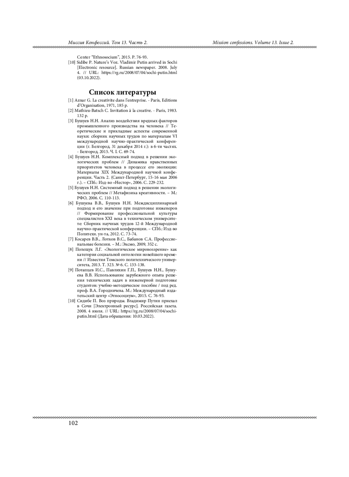 5. Бушуев Н.Н. Системный подход в решении экологических проблем // Метафизика креативности. - М.: РФО, 2006. С. 110-113.