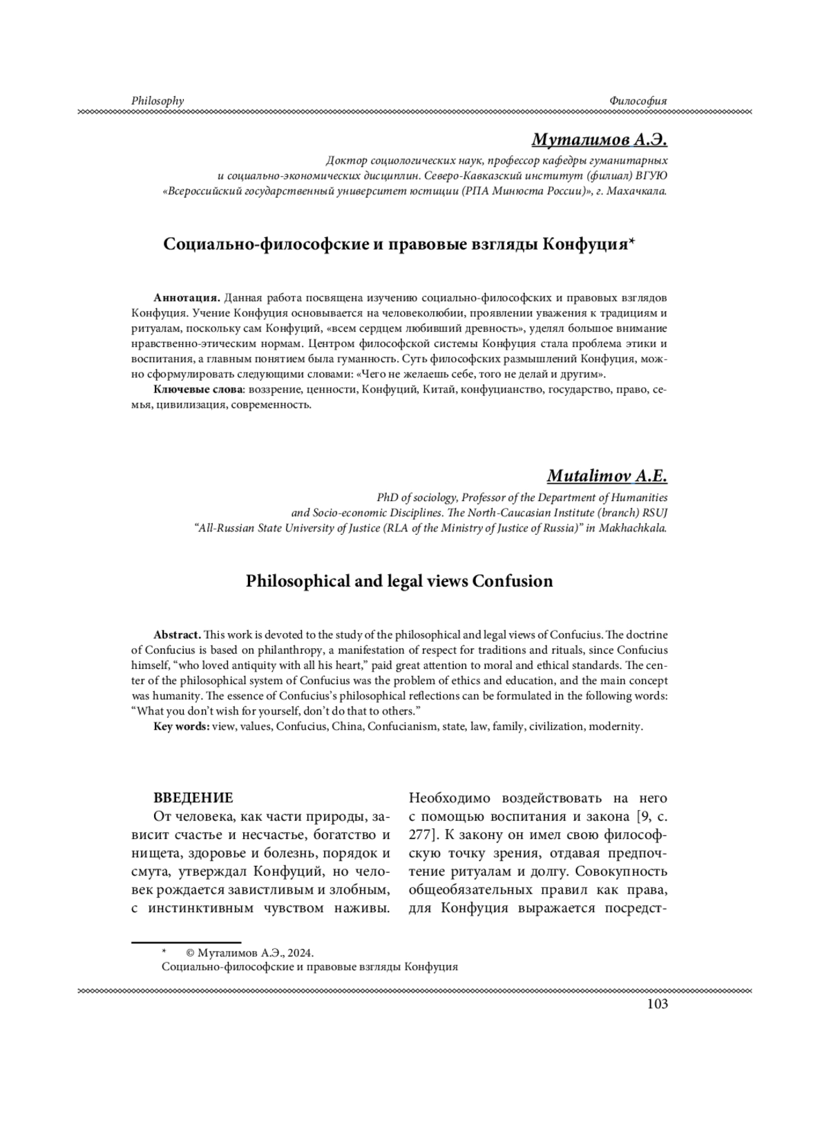 Данная работа посвящена изучению социально-философских и правовых взглядов Конфуция. Учение Конфуция основывается на человеколюбии, проявлении уважения к традициям и ритуалам, поскольку сам Конфуций, «всем сердцем любивший древность», уделял большое внимание нравственно-этическим нормам. Центром философской системы Конфуция стала проблема этики и воспитания, а главным понятием была гуманность. Суть философских размышлений Конфуция, можно сформулировать следующими словами: «Чего не желаешь себе, того не делай и другим».