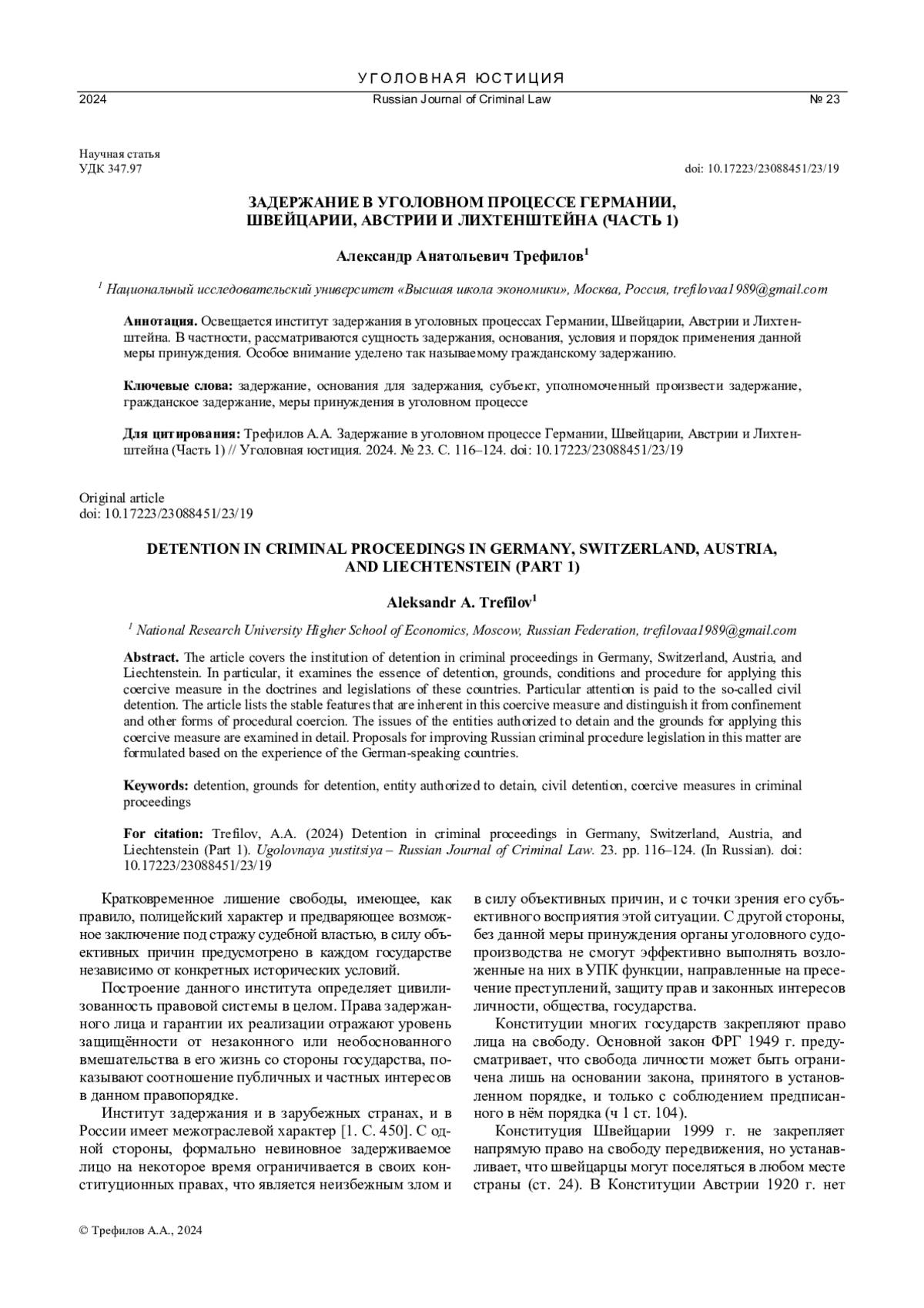 1. Россинский С.Б. Задержание подозреваемого: конституционно-межостраслевой подход. М.: Проспект, 2019. 192 с. EDN: YYMNBB