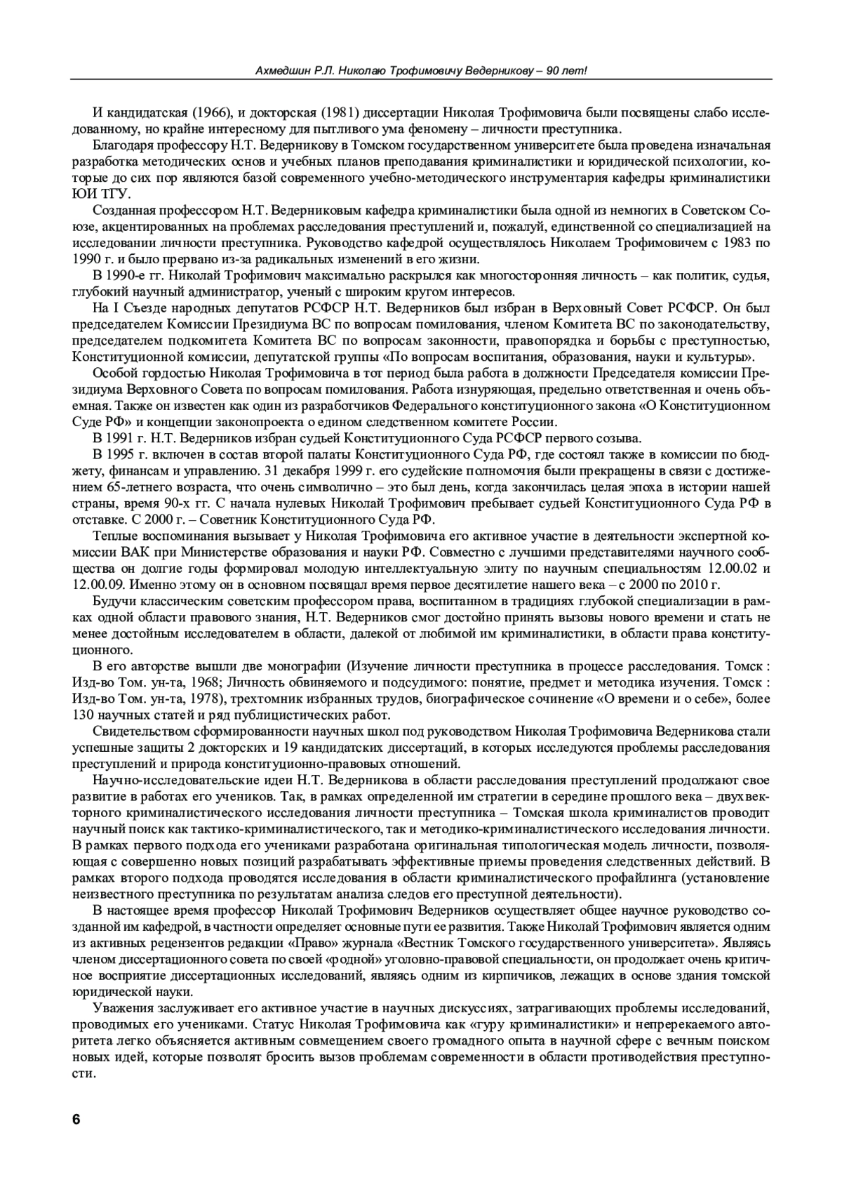 Рассматривается творческий и научный путь видного деятеля российской юстиции, профессора, доктора юридических наук, судьи Конституционного Суда РФ в почетной отставке Николая Трофимовича Ведерникова. Автор заявляет об отсутствии конфликта интересов.