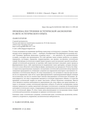 Статья посвящена исследованию проблемы вынесения эстетического суждения. Почему люди находят нечто прекрасным, а иное - наоборот, безобразным? Как формируется разница вкусов? Основная проблема вынесения суждения вкуса - это неясность тех аксиологических условий, в которых оно производится. По этой причине такие условия требуется, во-первых, определить, во-вторых, определив, скорректировать сам процесс построения эстетических теорий. Целый ряд эстетических теорий терпит неудачу в деле построения строгой и всеобъемлющей эстетической аксиологии по причине либо недостаточного описания самого процесса формирования вкуса, либо произвольности выдвижения таких критериев, которые оказываются не в силах объяснить многообразие форм, оцениваемых как прекрасное. В качестве общего недостатка практикуемых подходов к построению эстетической аксиологии автор выделяет заведомую предзаданность отношения суждения как выражения некоторого чувственного отношения к эстетическому объекту. В статье показывается, что активность чувства при пассивности его выражения, идея об их строго фиксированной и однонаправленной форме влияния несостоятельна, так как не соответствует многим повседневным эстетическим ситуациям. Демонстрируется, что знак и выражение находятся в ситуации зеркального обмена, и в качестве принципа эстетической теории не может выступать субъект-объектное отношение. Вместо этого вводится понятие интенсивности переживания как силы образа для представления, которое и составляет основу эстетической практики субъекта. В качестве альтернативы такому подходу предлагается замена оценочной категории эстетического суждения на безоценочную категорию эстетического опыта, утверждающую принципиальную аксиологическую нейтральность эстетической сферы. В статье также даны рекомендации по построению новых теорий эстетической аксиологии, исходящих из примата эстетического опыта.