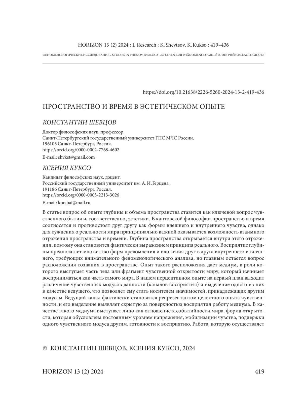 В статье вопрос об опыте глубины и объема пространства ставится как ключевой вопрос чувственного бытия и, соответственно, эстетики. В кантовской философии пространство и время соотносятся и противостоят друг другу как формы внешнего и внутреннего чувства, однако для суждения о реальности мира принципиально важной оказывается возможность взаимного отражения пространства и времени. Глубина пространства открывается внутри этого отражения, поэтому она становится фактически выражением принципа реального. Восприятие глубины предполагает множество форм преломления и вложения друг в друга внутреннего и внешнего, требующих внимательного феноменологического анализа, но главным остается вопрос расположения сознания в пространстве. Опыт такого расположения дает медиум, в роли которого выступает часть тела или фрагмент чувственной открытости миру, который начинает восприниматься как часть самого мира. В нашем перцептивном опыте на первый план выходит различение чувственных модусов данности (каналов восприятия) и выделение одного из них в качестве ведущего, что позволяет ему стать носителем значимостей, принадлежащих другим модусам. Ведущий канал фактически становится репрезентантом целостного опыта чувственности, и его выделение выявляет скрытую за поверхностью восприятия работу медиума. В качестве такого медиума выступает лицо как отношение к событийности мира, форма открытости, которая обусловлена постоянным уровнем напряжения, мобилизации чувства, поддержки одного чувственного модуса другим, готовности к восприятию. Работа, которую осуществляет медиум, ведет к возникновению образа как формы вхождения в пространство и время, в которой чувственное присутствие обретает свою цельность. Эстетический опыт возвращает к первичному феномену присутствия в чувственности и открытости чувственности времени и пространству, благодаря чему чувственность проживается не только как данность, но и как возможность возрастания субъекта в отношении как себя, так и мира.