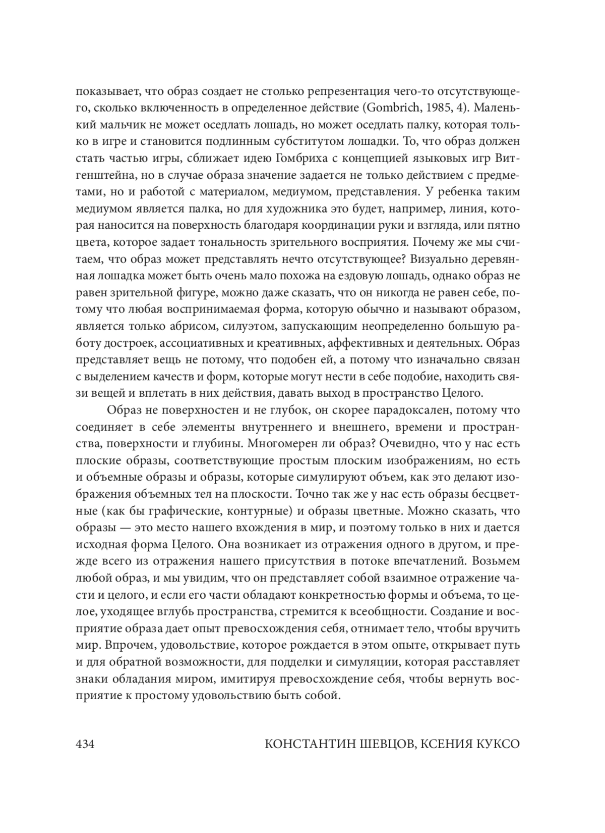 Здесь показателен стереоскопический эффект. Наложение образов, воспринимаемых правым и левым глазом, само по себе ничего не говорит о переживании объема, но если мы учтем, что один из этих образов всегда обладает качеством размытости, тогда как второй за счет наложения обретает бóльшую определенность, то мы поймем, что переживание объема рождается вместе с самим восприятием, переходом от относительной размытости образа к определенной фигуре. Не удивительно тогда, что переживание глубины по-настоящему захватывает дух — будь то объем живого пространства или иллюзорная глубина картины, в которой взгляд находит для себя идеальное осуществление, своего рода идеальное тело. Вот почему переживание объема и глубины дает не только опыт реального, но и форму возрастания чувственности, возможность выражения себя и удовольствие от игры, которая связывает выражение чувства с его интенсивностью.