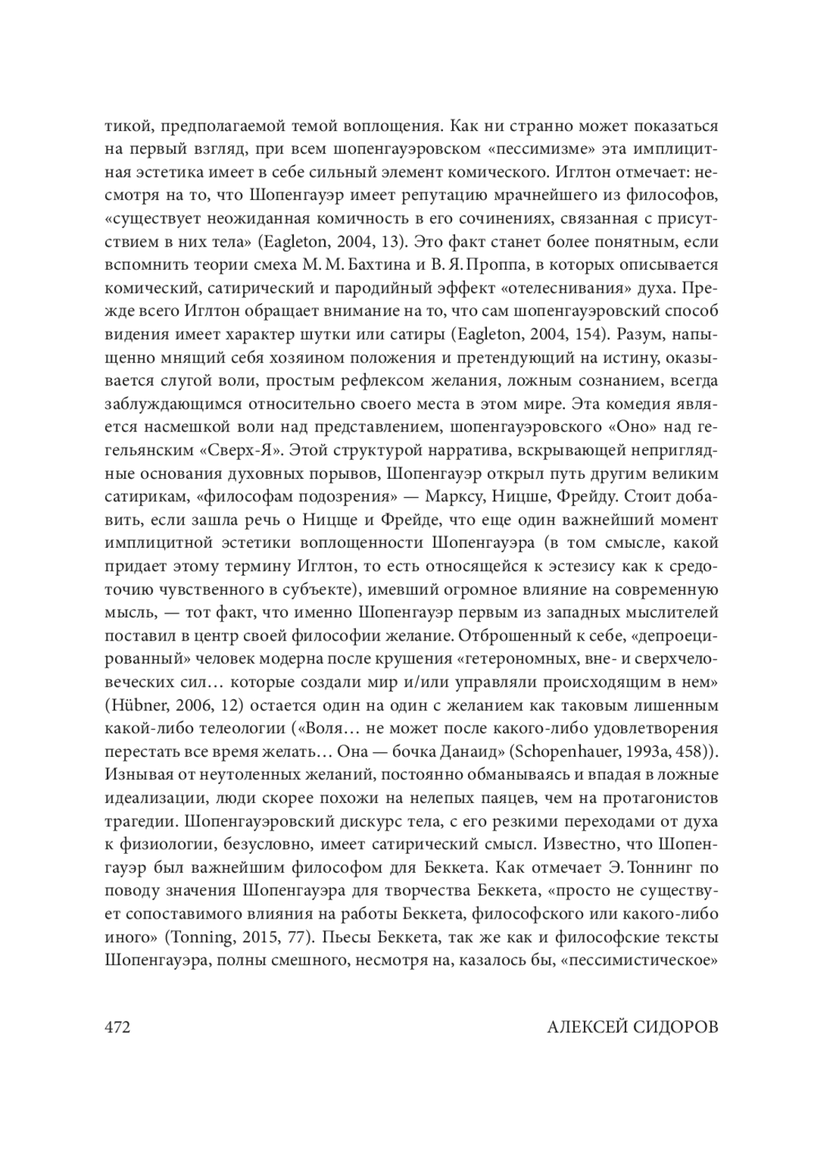 Основной тезис данной статьи состоит в том, что именно Артуру Шопенгауэру в европейской философской традиции принадлежит отчетливая формулировка проблемы телесности как существенной проблемы философской мысли. С точки зрения автора статьи, Шопенгауэра можно понимать как философа и даже как феноменолога телесности. Впервые в новоевропейской мысли Шопенгауэр эксплицитно описывает связь сознания и тела, предлагает феноменологическое описание опыта воплощенности субъекта, сближающее его мысль с будущей феноменологией тела М. Мерло-Понти. В статье рассматривается роль тела в формировании субъектности, а также соотносимость понятия тела и понятия воли в структуре шопенгауэровской мысли. И для Шопенгауэра, и для Мерло-Понти тело является ключом к получению опыта о мире и к преодолению дихотомии субъекта и объекта. Однако если Мерло-Понти приветствует такой вывод, для Шопенгауэра он является источником пессимистического сарказма: воля, которая делает меня мною, совершенно безразлична к моему индивидуальному существованию и использует меня как материал для своего бессмысленного воспроизводства. Тем не менее акцентировка телесности существенна для становления и развития эстетики как дисциплины в XVIII в. Т. Иглтон, называющий эстетику «дискурсом тела», полагает, что философия Шопенгауэра вносит важнейший вклад в модернистский проект эстетики не столько своей «эксплицитной» эстетической концепцией, сколько «имплицитной» эстетикой, предполагаемой развитием темы воплощения, с которой он связывает неожиданную «комичность» философии Шопенгауэра, подходящей для интерпретации абсурдистского искусства. В статье также рассматривается влияние философии Шопенгауэра на творчество С. Беккета, которое С. Гарнер истолковывает посредством феноменологии тела Мерло-Понти, доказывая, что размышления последнего о теле и плоти можно соотнести с театром Беккета, где на первый план выдвигается телесное, физическое присутствие актеров.