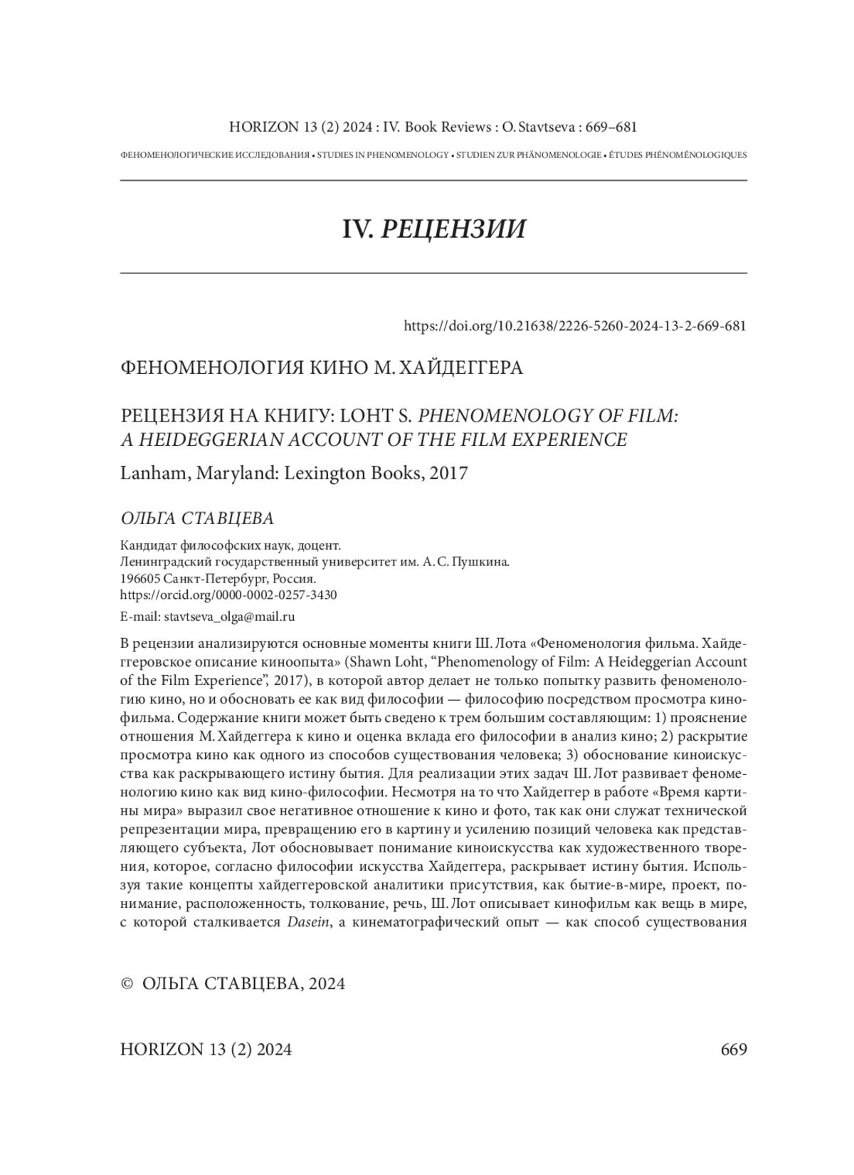 В рецензии анализируются основные моменты книги Ш. Лота «Феноменология фильма. Хайдеггеровское описание киноопыта» (Shawn Loht, “Phenomenology of Film: A Heideggerian Account of the Film Experience”, 2017), в которой автор делает не только попытку развить феноменологию кино, но и обосновать ее как вид философии - философию посредством просмотра кинофильма. Содержание книги может быть сведено к трем большим составляющим: 1) прояснение отношения М. Хайдеггера к кино и оценка вклада его философии в анализ кино; 2) раскрытие просмотра кино как одного из способов существования человека; 3) обоснование киноискусства как раскрывающего истину бытия. Для реализации этих задач Ш. Лот развивает феноменологию кино как вид кино-философии. Несмотря на то что Хайдеггер в работе «Время картины мира» выразил свое негативное отношение к кино и фото, так как они служат технической репрезентации мира, превращению его в картину и усилению позиций человека как представляющего субъекта, Лот обосновывает понимание киноискусства как художественного творения, которое, согласно философии искусства Хайдеггера, раскрывает истину бытия. Исполь- зуя такие концепты хайдеггеровской аналитики присутствия, как бытие-в-мире, проект, понимание, расположенность, толкование, речь, Ш. Лот описывает кинофильм как вещь в мире, с которой сталкивается Dasein, а кинематографический опыт - как способ существования человека. Феноменологию автор понимает как метод, акцентирующий внимание на явлениях в том виде, как их переживает человек. Лот делает вывод, что кинофильмы фундаментально феноменологичны. Предмет феноменологии кино - пространство между зрителем и экраном, открытие и понимание, которые производит зритель. Феноменология кино - феноменология присутствия кинозрителя. На стержневой вопрос «Можно ли философствовать с помощью кино?» Лот отвечает утвердительно, но это философствование будет феноменологией. Зритель философствует, просматривая фильм, что основывается на самопонимании присутствия, философские размышления зрителя вызваны фильмом
