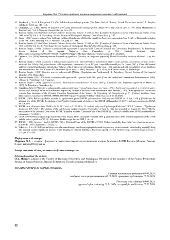 5. Ситковская О.Д. Значение психологических знаний для решения вопросов об уголовной ответственности лиц с психическими расстройствами в рамках вменяемости // Вестник Академии Генеральной прокуратуры Российской Федерации. 2018. № 2 (64). С. 75. EDN: OSZQNN