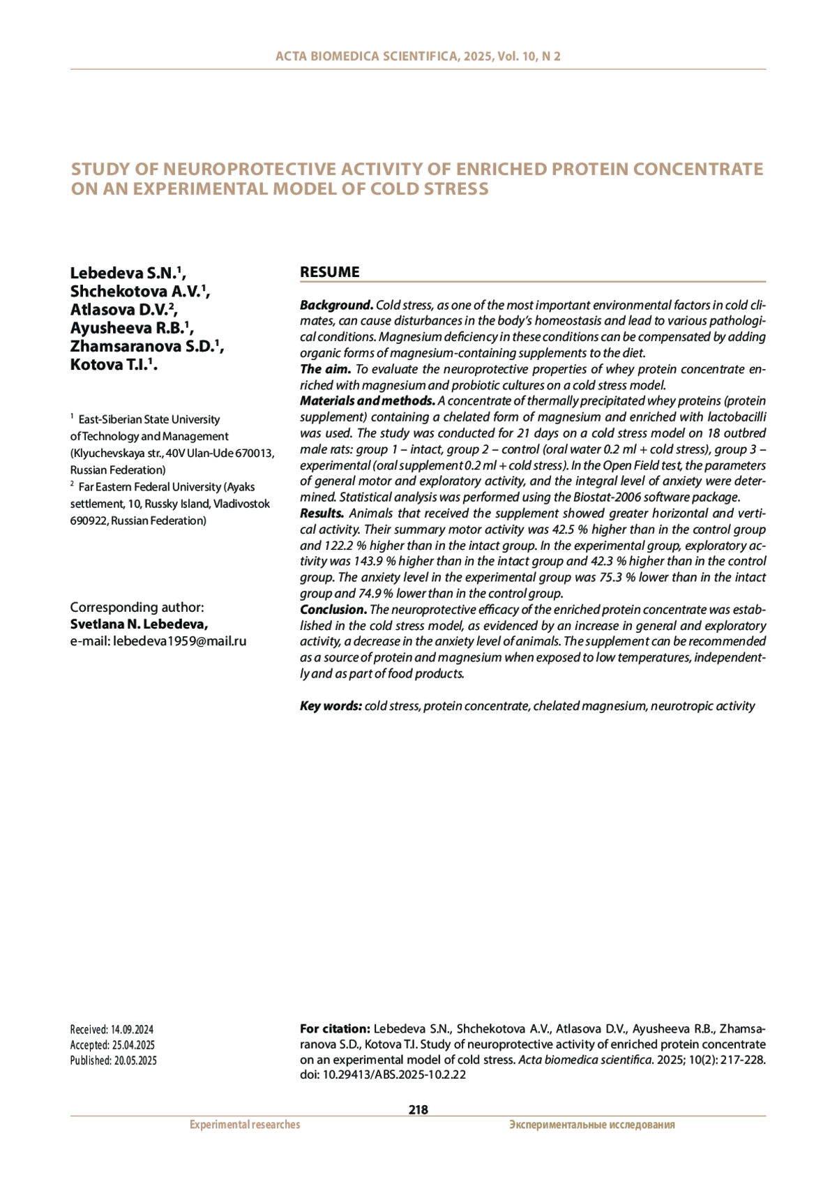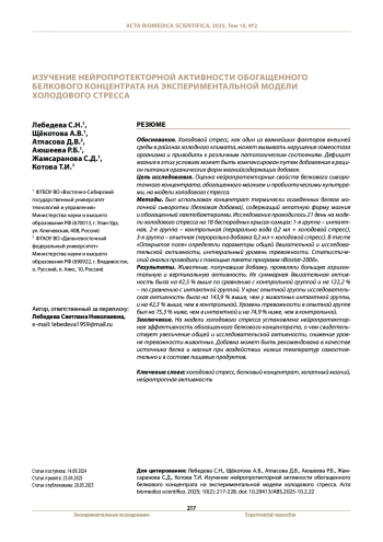Заключение. На модели холодового стресса установлена нейропротекторная эффективность обогащенного белкового концентрата, о чем свидетельствует увеличение общей и исследовательской активности, снижение уровня тревожности животных. Добавка может быть рекомендована в качестве источника белка и магния при воздействии низких температур самостоятельно и в составе пищевых продуктов.