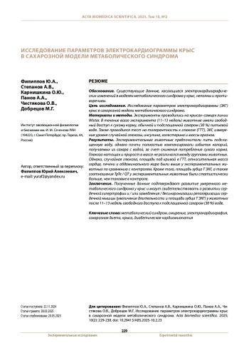 Заключение. Полученные данные подтверждают развитие умеренного метаболического синдрома у крыс и могут свидетельствовать о развитии сердечной гипертрофии и / или замедления / десинхронизации реполяризации сердечной мышцы (увеличение длительности и площади зубца Т ЭКГ) у животных после 11–13 недель свободного доступа к подслащенной сахаром (30 %) воде.