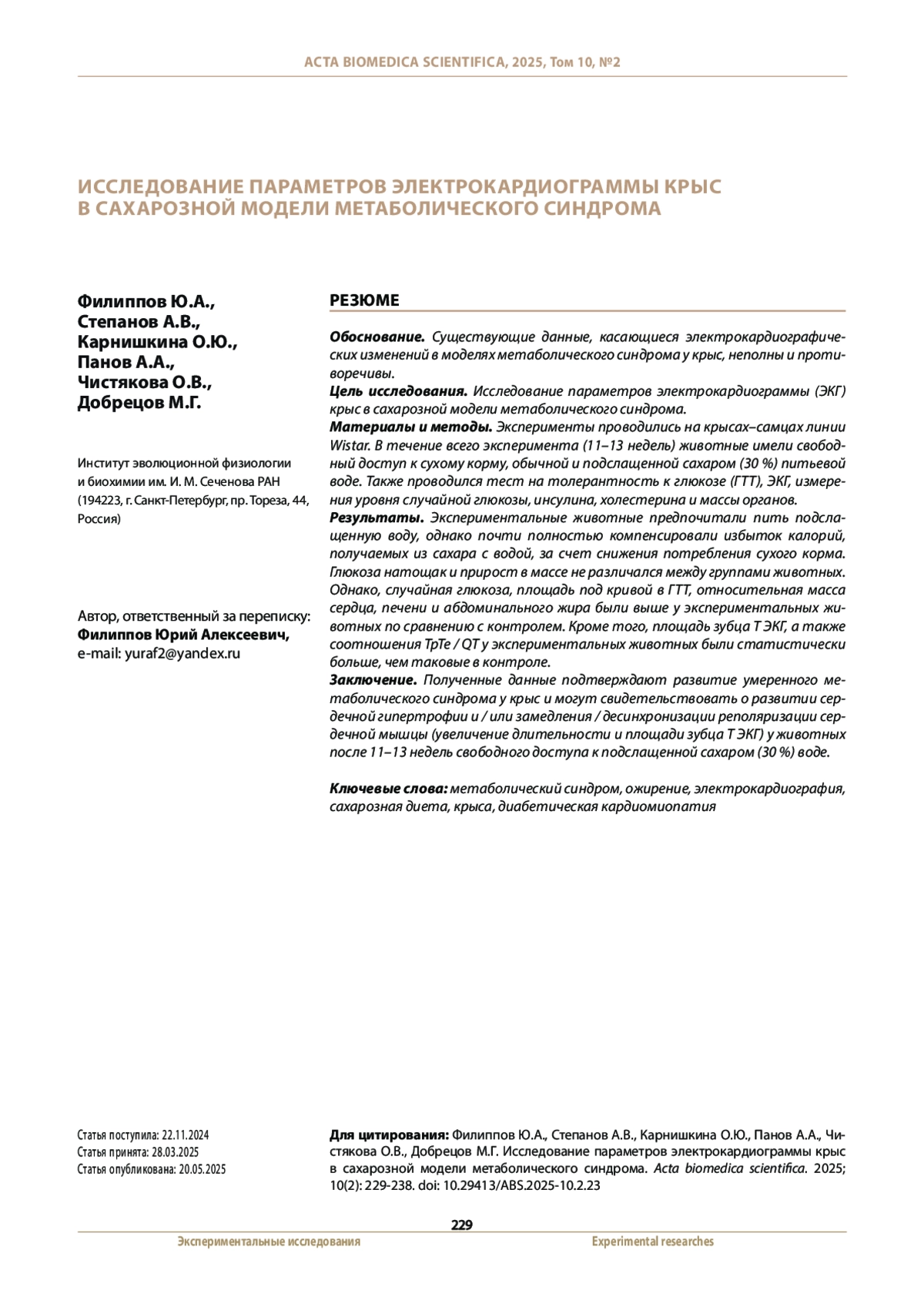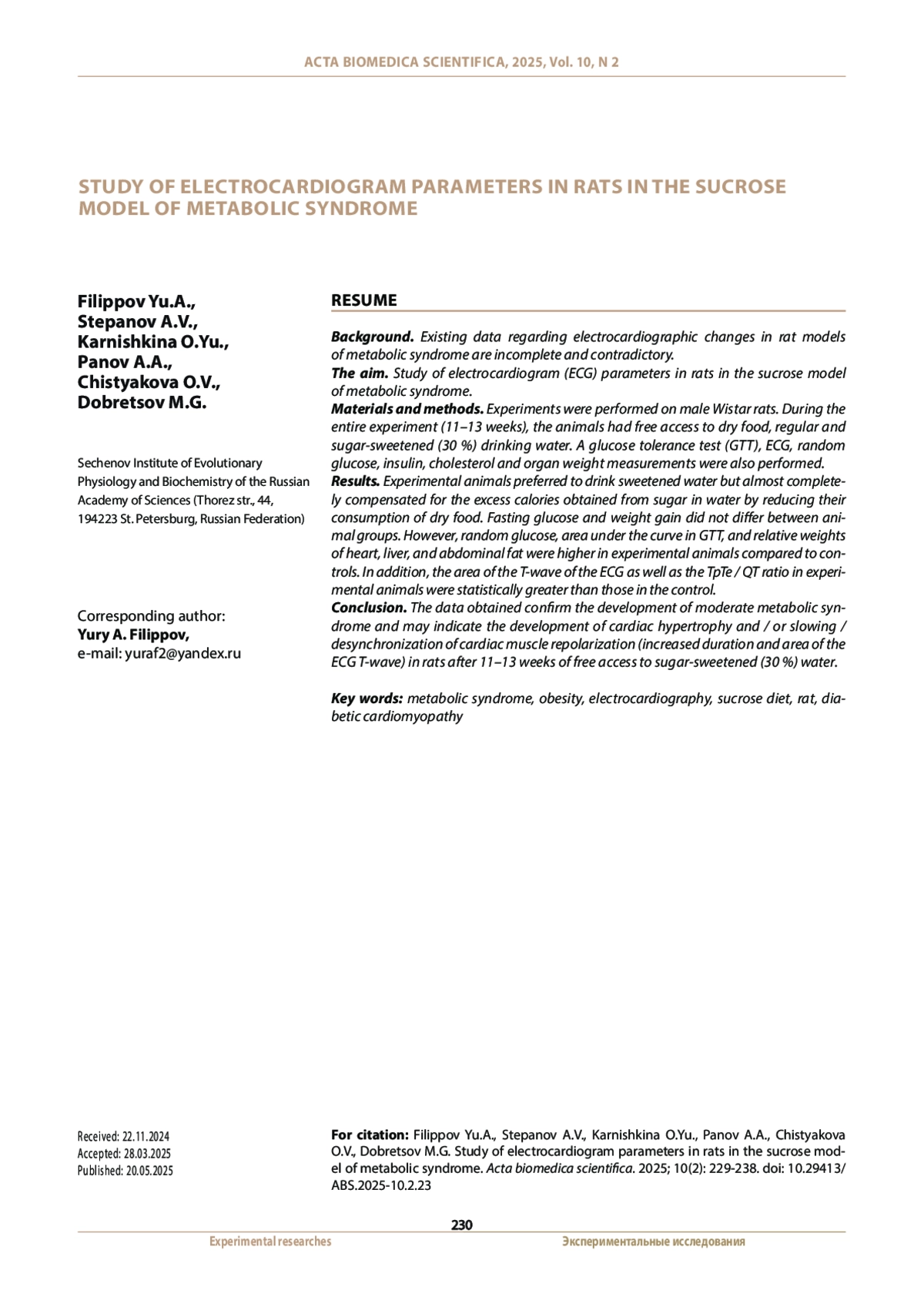 17. Filippov YA, Stepanov AV, Karnishkina OY, Panov AA, Chistyakova OV, Dobretsov MGг. Comparison of liquid and dry sucrose diets in the development of a model of metabolic syndrome in rats. Integr Physiol. 2023; 4(3): 373-378. doi: 10.33910/2687-1270-2023-4-3-373-378