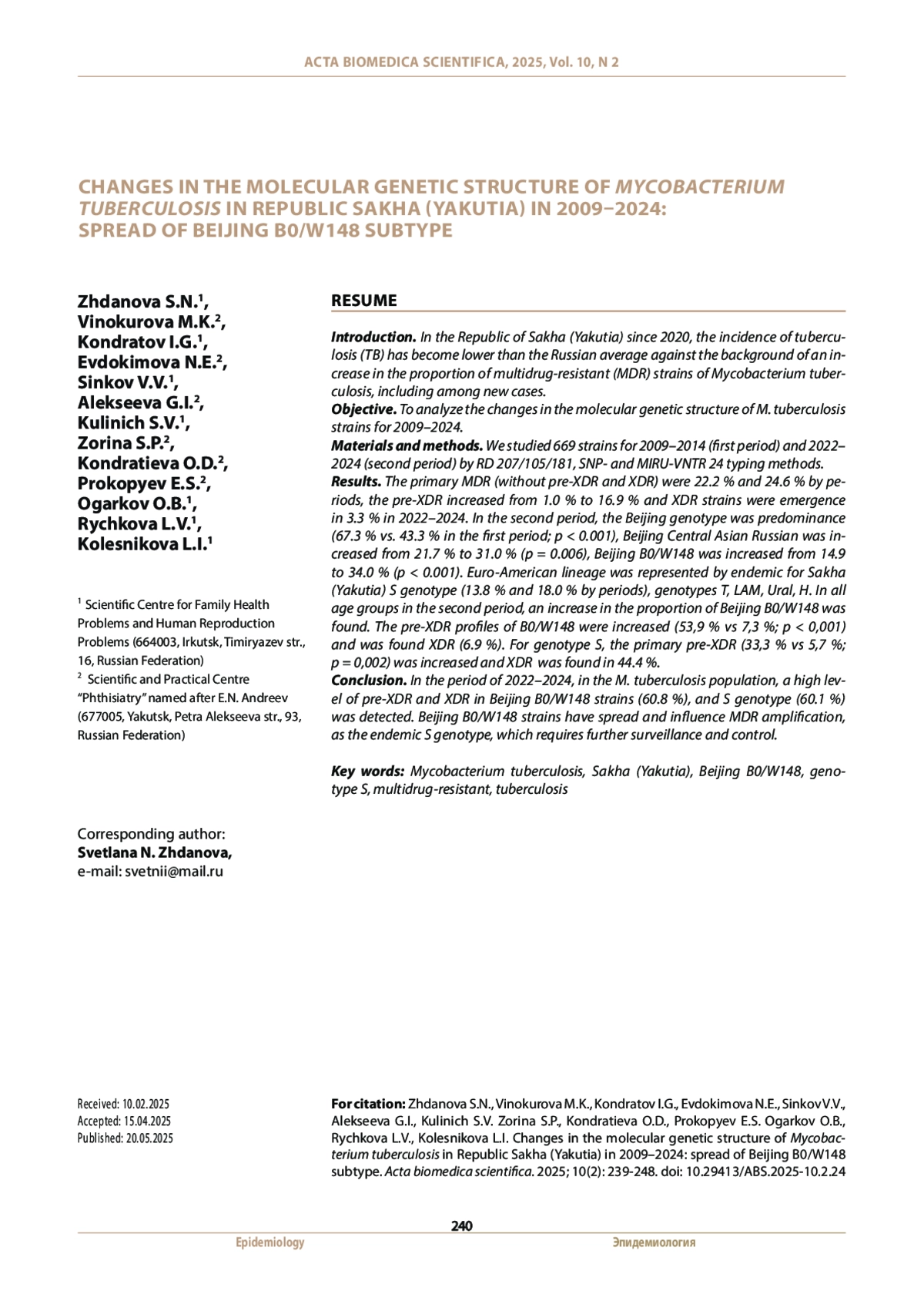 Республика Саха (Якутия) (РС(Я)) заняла устойчивые позиции территории со средними показателями заболеваемости туберкулезом (ТБ) благодаря выраженной динамике снижения в период с 2009 по 2023 гг. (с 82,1 до 30,2 на 100 тыс. населения соответственно), это привело к тому, что с 2020 года их уровни стали ниже среднероссийских значений [1]. Снижение показателя заболеваемости ТБ за десятилетний период сопровождается увеличением доли штаммов Mycobacterium tuberculosis с множественной лекарственной устойчивостью (МЛУ), в том числе среди новых случаев ТБ [2].