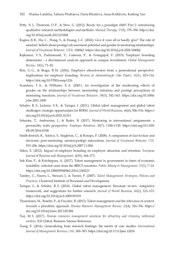 LATUKHA M., PITUBAEVA T., KHASIEVA D., KRIKLIVETC A., KAIFENG Y. EXTERNAL MENTORING AS A TALENT ATTRACTION TOOL IN THE TALENT SHORTAGE CONTEXT // BRICS JOURNAL OF ECONOMICS. 2025. № 1, ТОМ 6
