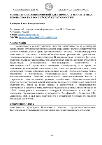 Необходимость концептуализации понятия «идентичность» и «культурная безопасность» обусловлена использованием в современной научной литературе этих понятий в разных, иногда прямо противоположных, смыслах. Основными формами идентичности считаются этническая/национальная, религиозная, гражданская, гражданско-правовая и цивилизационная. В зависимости от различных факторов, идентичность меняет свои формы, что актуализирует вопрос о способах культурной безопасности. Доминирование этно-культурной идентичности в многонациональной стране может приводить к сепаратизму, в то время как размывание национальной идентичности как следствие расширения культурных универсалий, чревато забвением национальных корней. Необходим баланс между традициями и инновациями, общенациональными ценностями России и этнонациональными. Вопросы национальной самоидентификации России в современных геополитических условиях приобретают общецивилизационный характер, поэтому важной задачей становится пересмотр теоретических оснований идентичности, поиск ее новой формы в соответствии с произошедшими изменениями в стране и в мире. Изменение идентификационных моделей влечет за собой трансформацию понимания культурной безопасности и способах ее реализации. По мнению ведущих культурологов (Астафьева О. Н., Малыгина И. В., Силантьева М. В. и др.) тема идентичности и культурной безопасности является важнейшей для России.