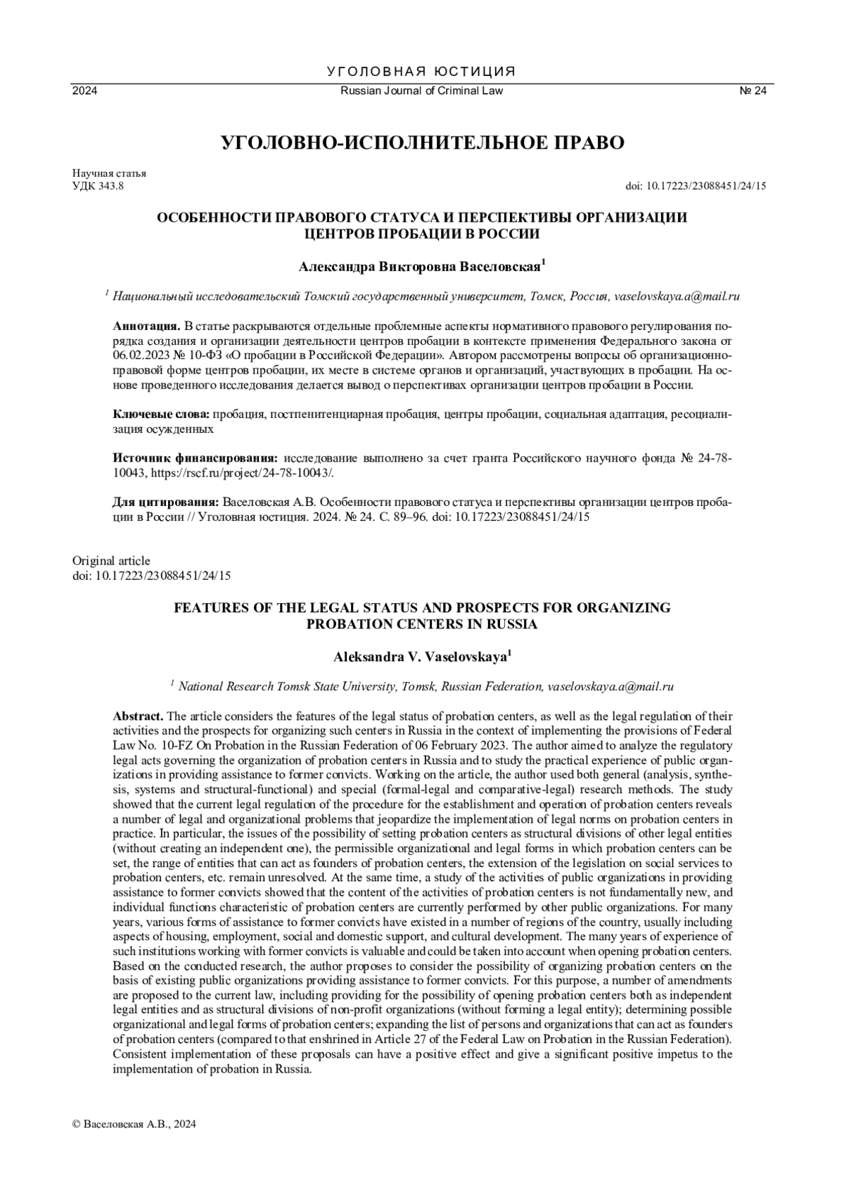 6. Гречаная А.А. Институты гражданского общества в обеспечении пробации в России // Современное право. 2024. № 2. С. 113-117. EDN: JYXCCH