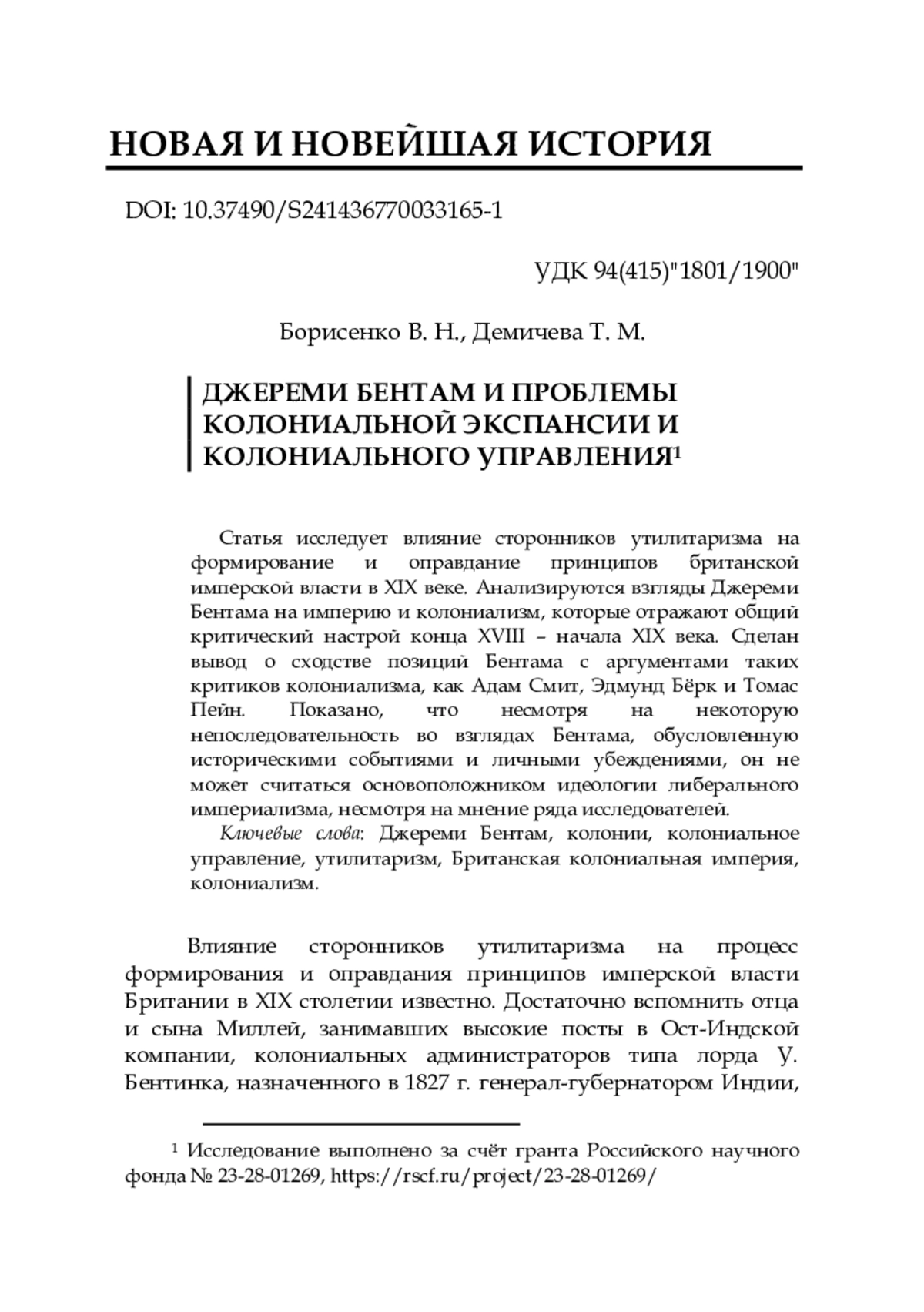 Статья исследует влияние сторонников утилитаризма на формирование и оправдание принципов британской имперской власти в XIX веке. Анализируются взгляды Джереми Бентама на империю и колониализм, которые отражают общий критический настрой конца XVIII - начала XIX века. Сделан вывод о сходстве позиций Бентама с аргументами таких критиков колониализма, как Адам Смит, Эдмунд Бёрк и Томас Пейн. Показано, что несмотря на некоторую непоследовательность во взглядах Бентама, обусловленную историческими событиями и личными убеждениями, он не может считаться основоположником идеологии либерального империализма, несмотря на мнение ряда исследователей.