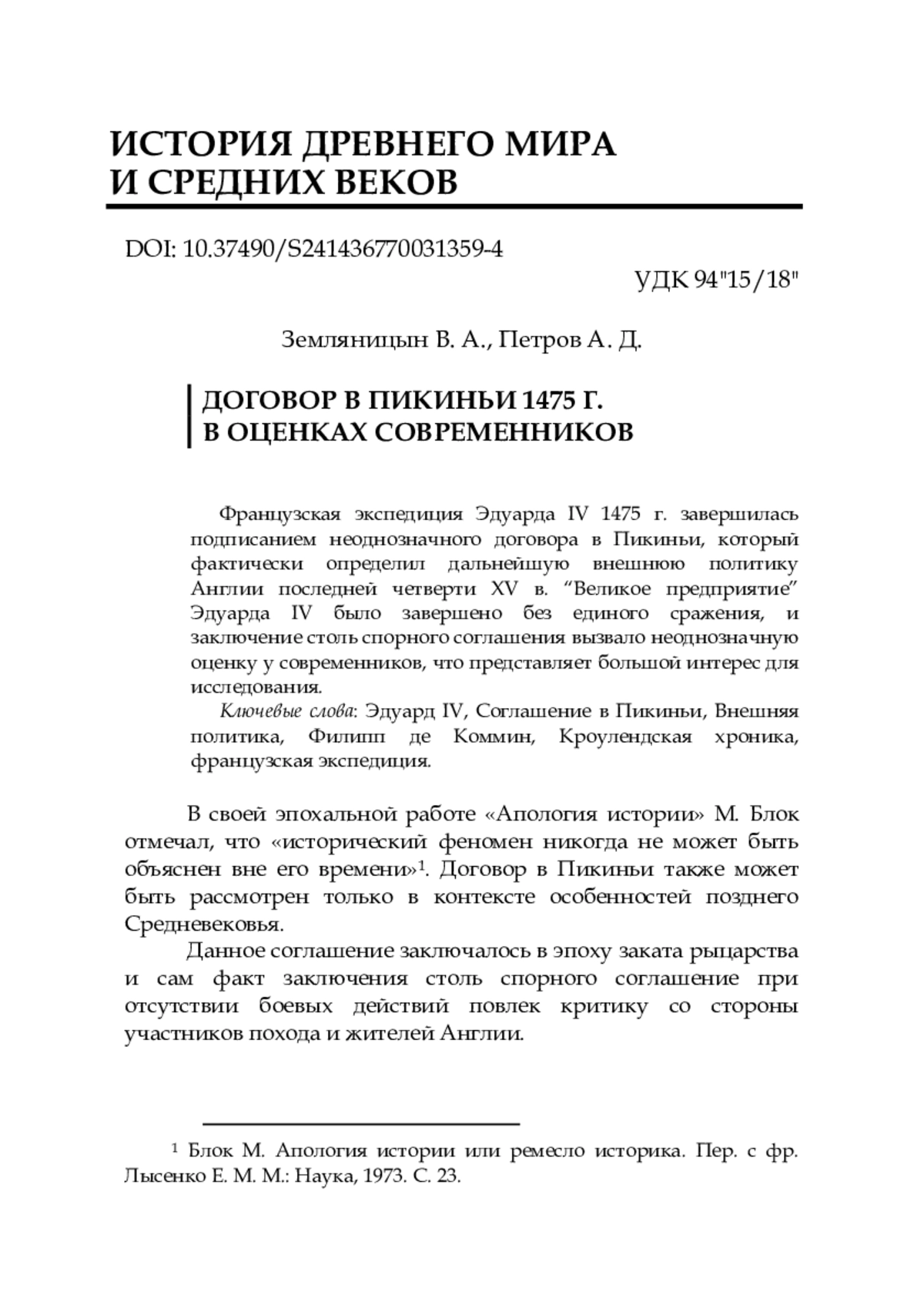 Французская экспедиция Эдуарда IV 1475 г. завершилась подписанием неоднозначного договора в Пикиньи, который фактически определил дальнейшую внешнюю политику Англии последней четверти XV в. “Великое предприятие” Эдуарда IV было завершено без единого сражения, и заключение столь спорного соглашения вызвало неоднозначную оценку у современников, что представляет большой интерес для исследования.