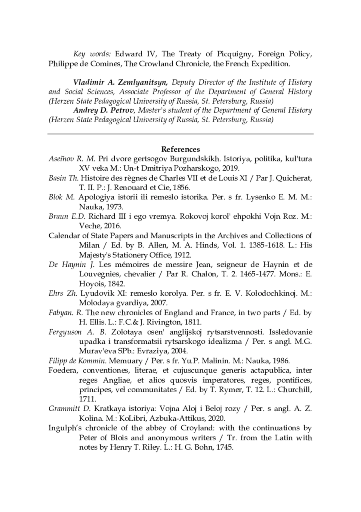 Ключевые фразы: эдуард iv, соглашение в пикиньи, внешняя политика, филипп де коммин, кроулендская хроника, французская экспедиция