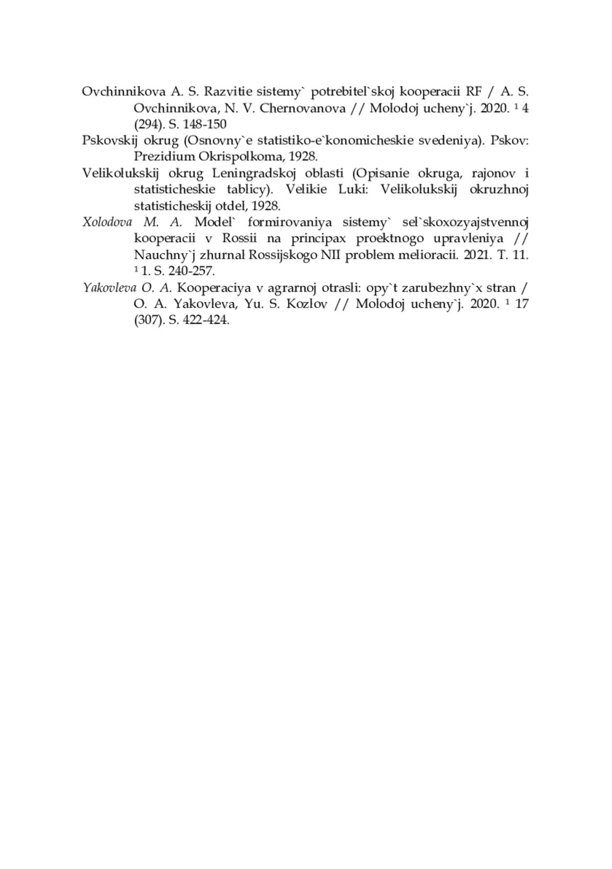 12. Корольков О. П. Восстановление и развитие сельскохозяйственной кооперации Псковской губернии (1921-1927 гг.) // Вестник Псковского государственного университета. Серия “Социально-гуманитарные науки”. Выпуск 2. Псков, 2015. С. 25-47. EDN: VYWIYP