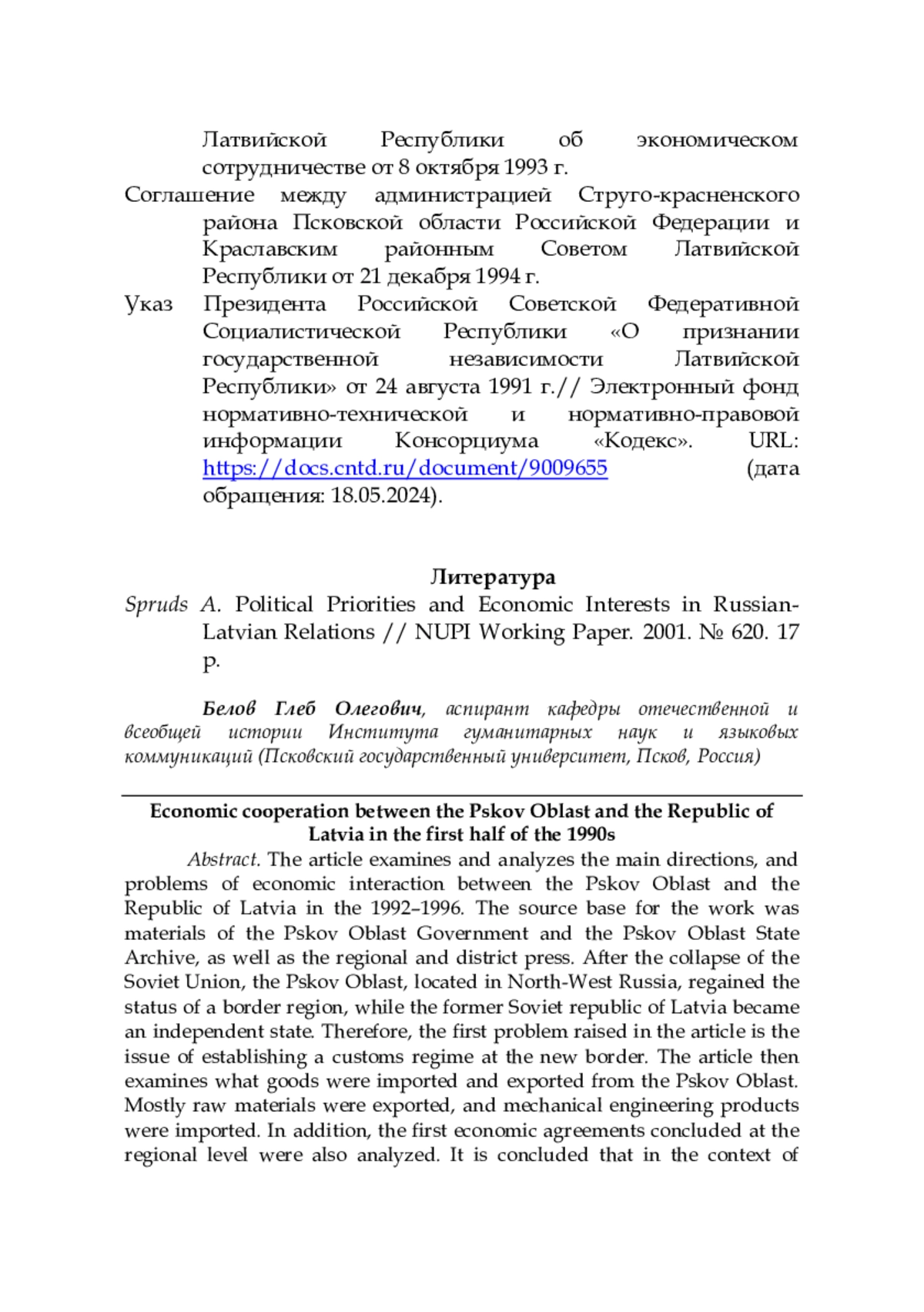 21. Spruds A. Political Priorities and Economic Interests in Russian-Latvian Relations // NUPI Working Paper. 2001. № 620. 17 p.