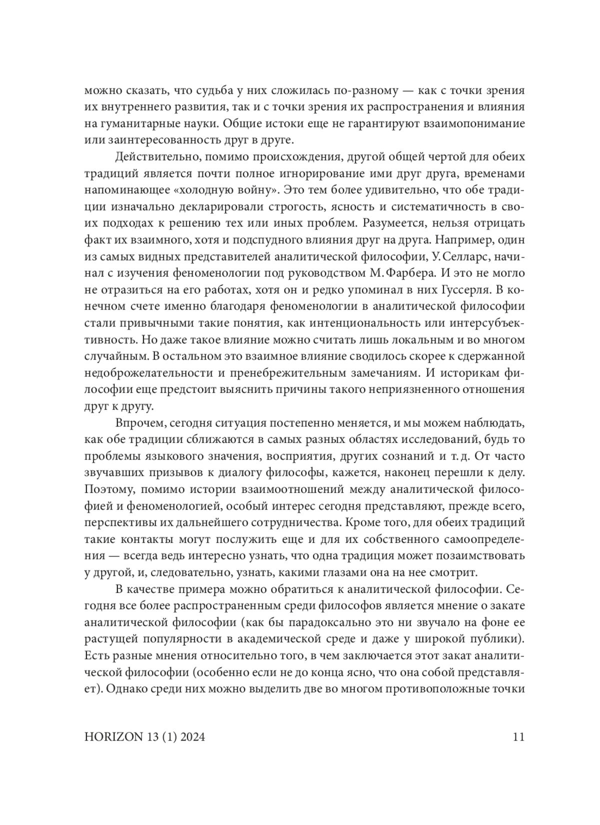 Сегодня ситуация постепенно меняется, и мы можем наблюдать, как обе традиции сближаются в самых разных областях исследований, будь то проблемы языкового значения, восприятия, других сознаний и т. д. От часто звучавших призывов к диалогу философы, кажется, наконец перешли к делу. Поэтому, помимо истории взаимоотношений между аналитической философией и феноменологией, особый интерес сегодня представляют, прежде всего, перспективы их дальнейшего сотрудничества. Кроме того, для обеих традиций такие контакты могут послужить еще и для их собственного самоопределения — всегда ведь интересно узнать, что одна традиция может позаимствовать у другой, и, следовательно, узнать, какими глазами она на нее смотрит.